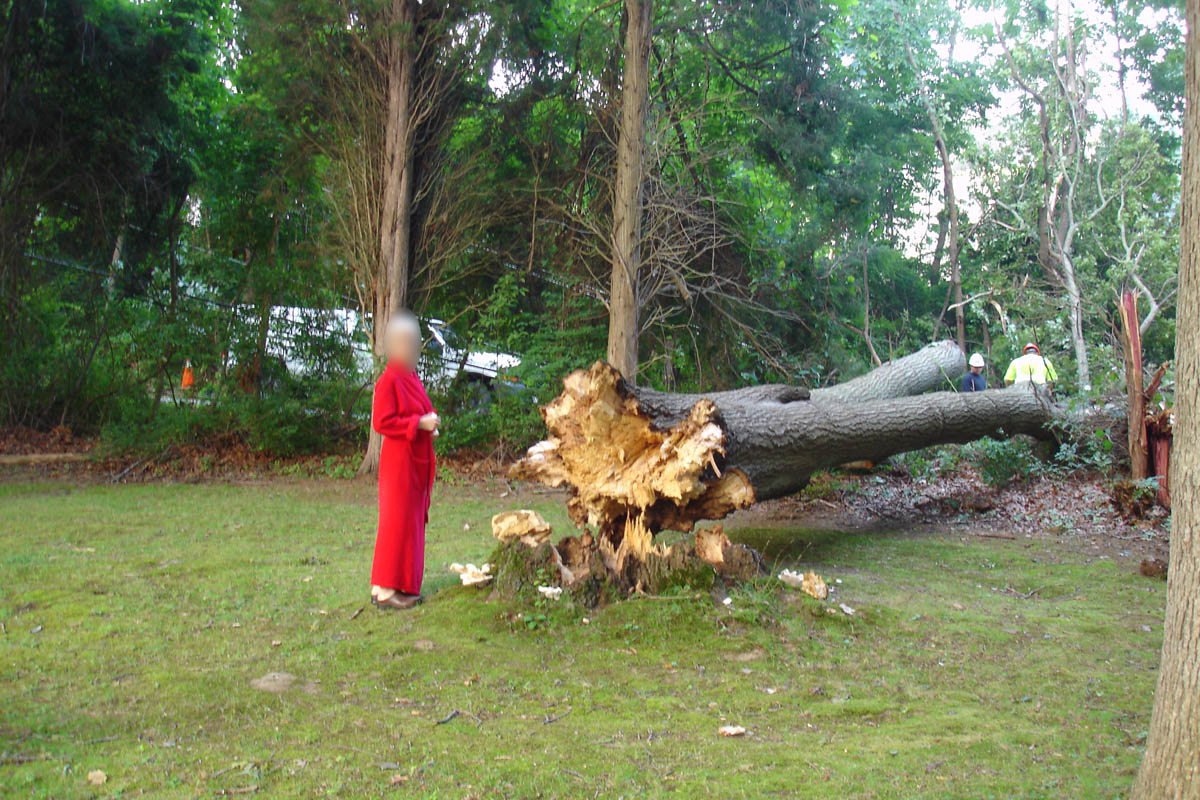 Плюс, что значит "убирать". Где-то это означает уборку в мешки, где-то, как у меня, можно задуть их в лес. Но и у меня это далеко, далеко, не час, ибо где-то половина участка под громадными дубами и кленами, и листьев от них вагоны. Вот один из упавших на участке дубов, для масштаба, и он же до падения.