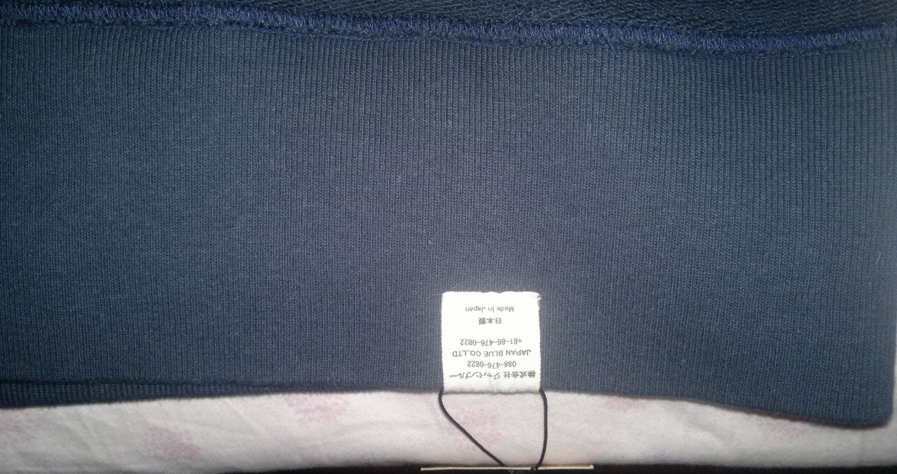 Для двух этих вариантов характерна одна особенность. Прежде чем нити начали превращаться в трикотажное полотно на лупвиллере, они были предварительно окрашены в несколько циклов "окрашивание-сушка" в цвет индиго. Всё точно так же как для нитей, используемых при производстве денима. Производство такого трикотажа и так довольно затратный по времени и усилиям процесс, здесь ко всему прочему добавлено ещё и окрашивание нитей.