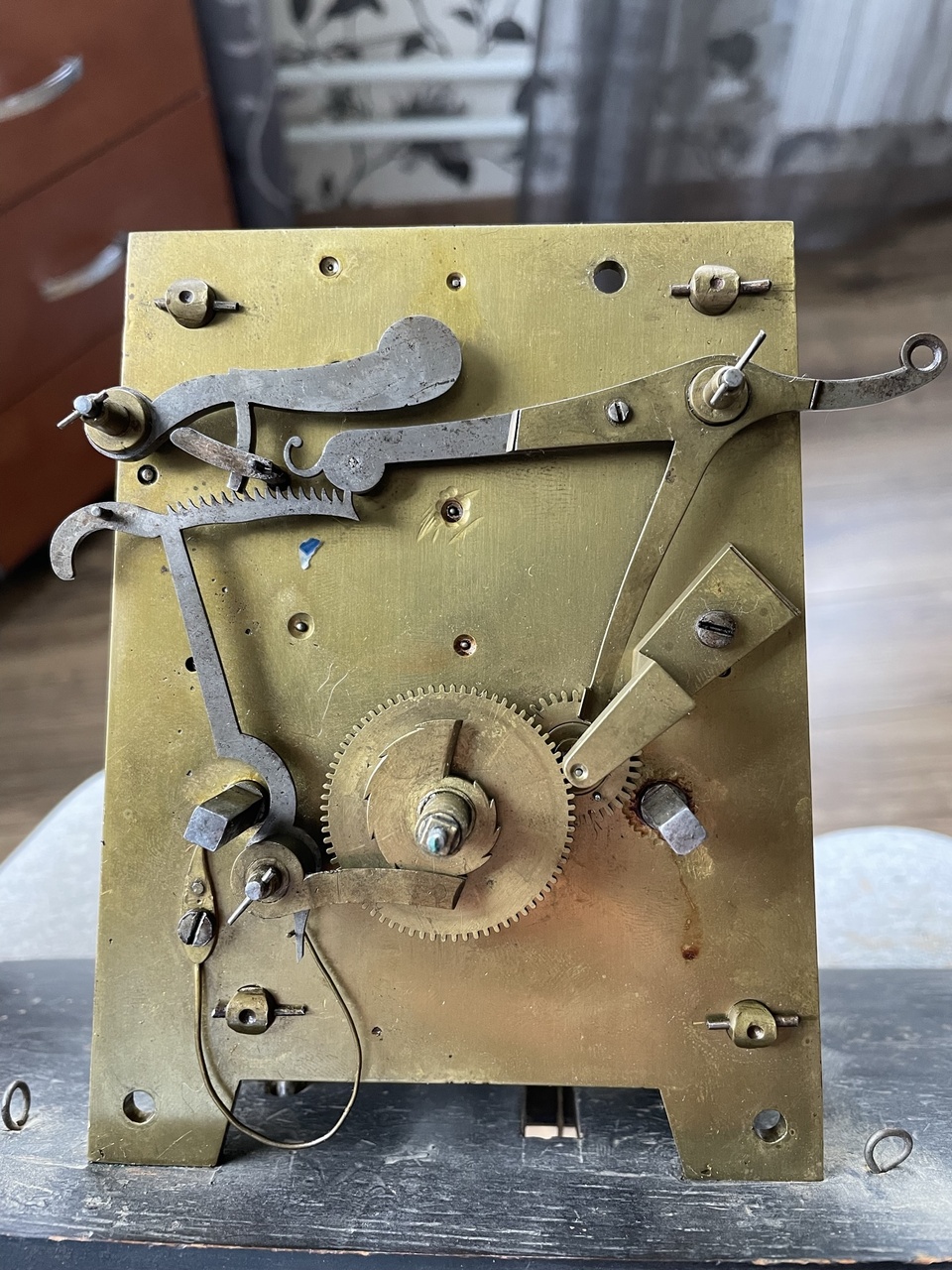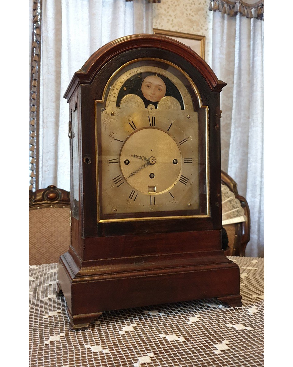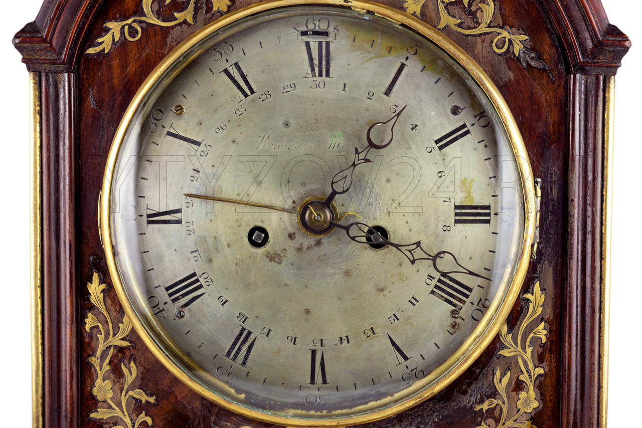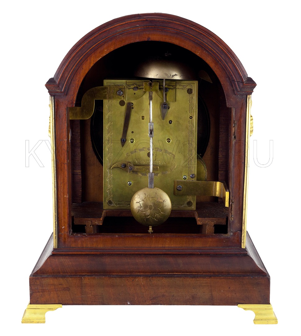 Механизм у антиквариата выполнен по английскому типу – с пружинным двигателем, два заводных барабана хода и боя, фузейным приводом (фузея - устройство, выравнивающее крутящий момент заводной пружины); со шпиндельным спуском, колокольным боем (на одном молотке); с численником.