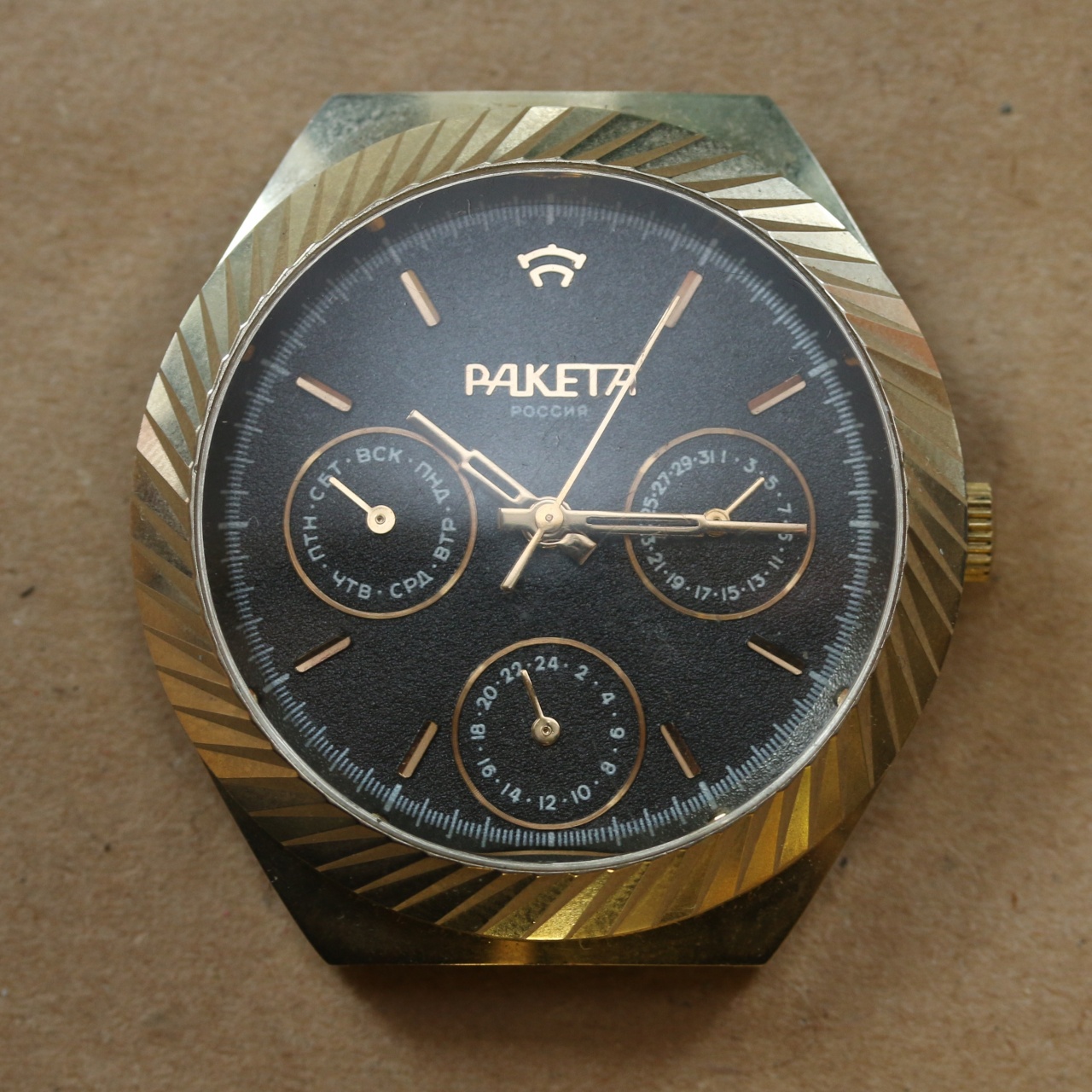 Да я не про стрелочный календарь а про колёса без золочения и нет накладных камней и нет фасок. 16 камней а не 19. Это я к тому что это всё же Ракета а не фейк как вы выразились.