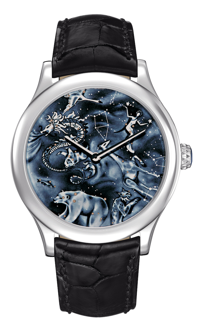 Что касается астрономической темы, то она не была исчерпана поэтическим планетарием. Часы, оформление которых связано с темой небес, созвездий и знаков зодиака появились в серии Extraordinary Dials. Вот, например, модель Midnight Nuit Boréale с циферблатом декорированным в технике гризайль. Корпус часов выполнен из белого золота. Модель выпущена тиражом 22 экземпляра.