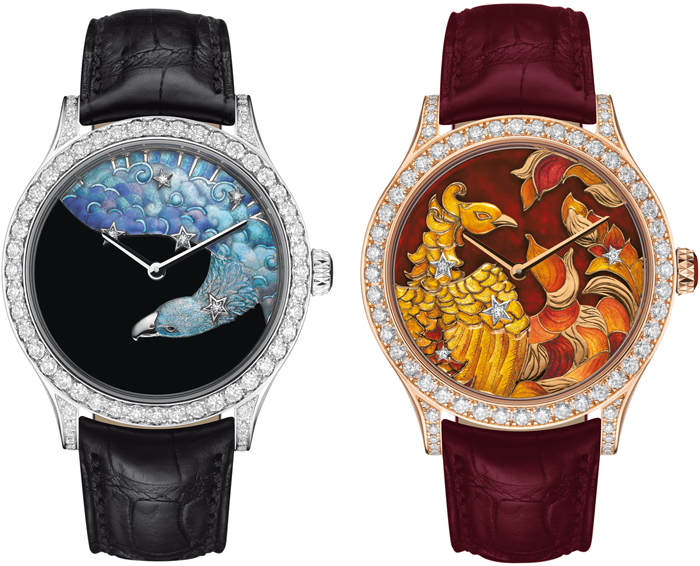 А это часы Midnight Constellations — четыре модели, изображающие созвездия Пегаса, Орла, Феникса и Петуха. Циферблаты и золотые корпуса украшены бриллиантами, гравировкой и отделаны эмалью. Тираж каждой модели — 22 штуки.