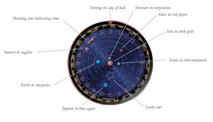 Время на циферблате указывает падающая звезда, которая перемещается по его периметру вдоль 24-часовой шкалы. Никаких других индикаторов нет, так что определение минут и секунд — задача глазомера и интуиции. Внешний край циферблата размечен еще и названиями месяцев. Вращая безель, можно в любой части этого календаря установить красную стрелку, которая указывает на некий «счастливый день». В означенный счастливый день голубой шарик, символизирующий нашу планету, окажется над звездой, выгравированной на сапфировом стекле. Можно выставлять на часах памятные даты или тешить своего внутреннего тирана, наблюдая за тем, как целая планета движется в заданную тобой точку.