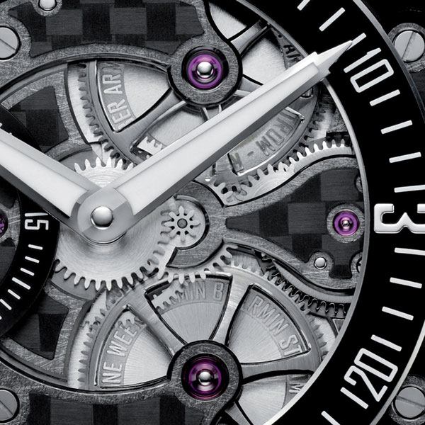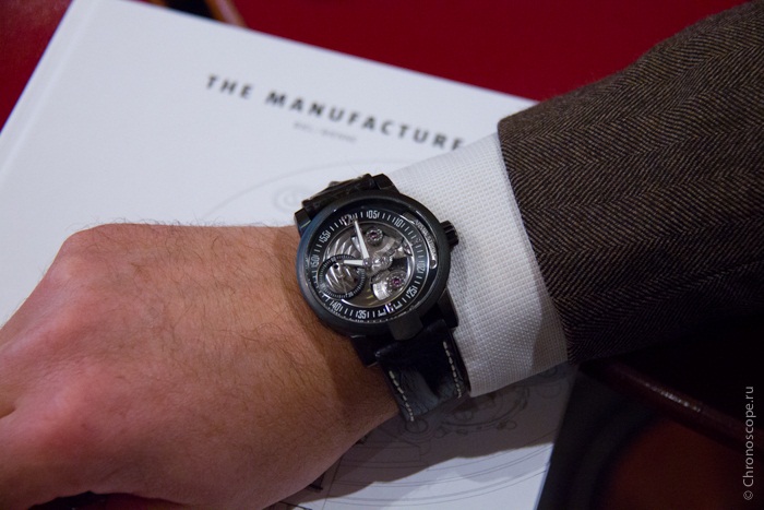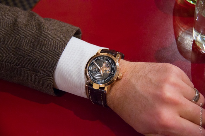 Цена: 78 000 швейцарских франков. Есть экземпляры из титана за 88 000, и из розового золота за 119 000. Выпуск каждой модели ограничен 50 экземплярами. Заметьте стрелки децентрализованы, немного сдвинуты влево. У турбийона есть маленькая секундная стрелка, а сам турбийон находится на отметке «9 часов», а не на отметке «6 часов» как обычно. Так что это весьма нестандартные часы. Будучи нишевым брендом, мы должны быть другими.