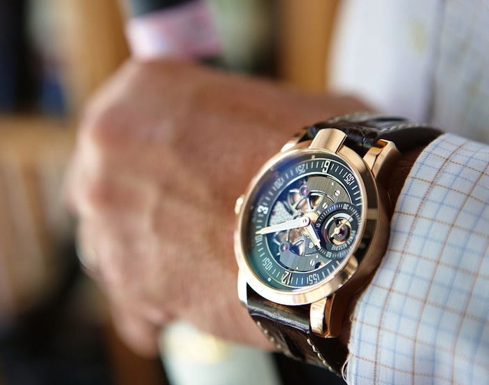 Вот часы с турбийоном, созданные на основе нашего первого собственного калибра, который называется One Week. У него два барабана и 10-дневный запас хода. Особенность модели в том, процесс завода механизма мы превратили в шоу. Смотрите, на циферблате расположены 2 колеса, они поворачиваются, когда человек крутит заводную головку.