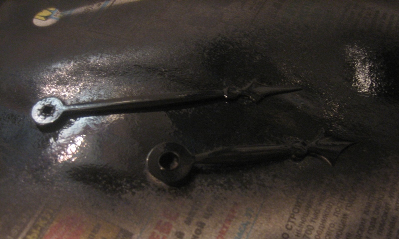 Стрелки от ржавчины отчистил до металла - пришлось красить. Краска черная матовая. Блестит - из-за того, что еще не высохла