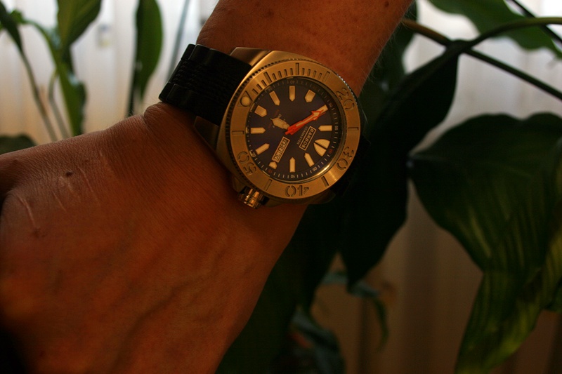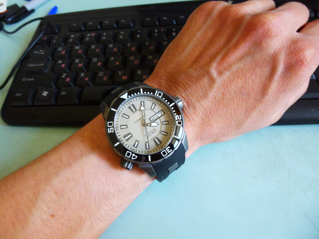 Размер у часов достойный, сталь хорошая, водозащита заявлена нормальная. Из минусов - минеральное стекло. До первого коралла. Ну и что оно за барбос такой... Мдя...