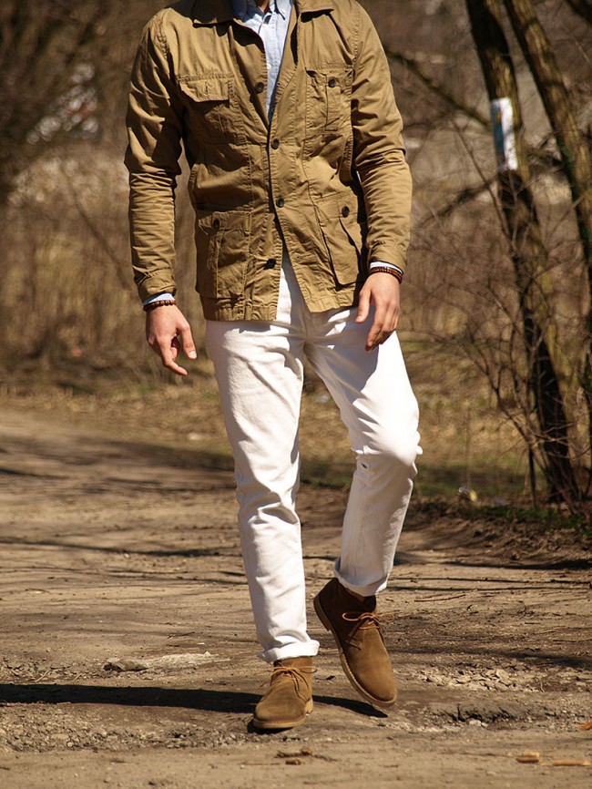 Дополнение: куртка должна быть из хлопка, в светлых тонах, воротник - стойка.