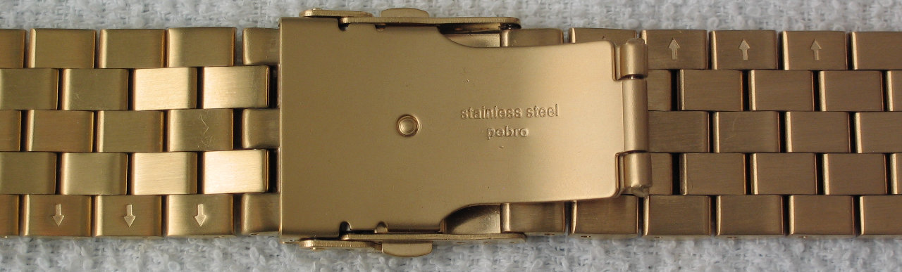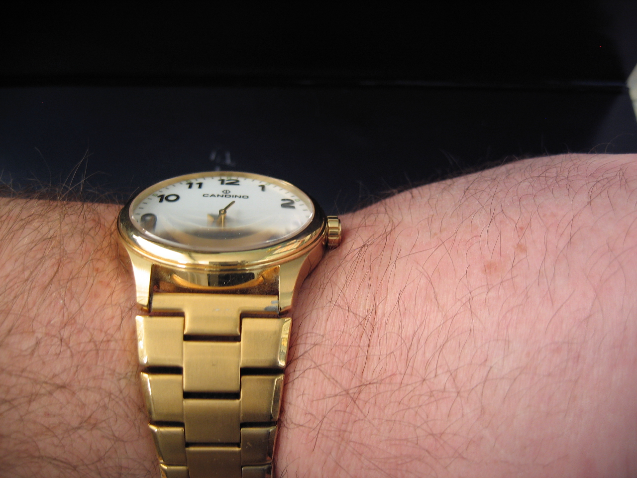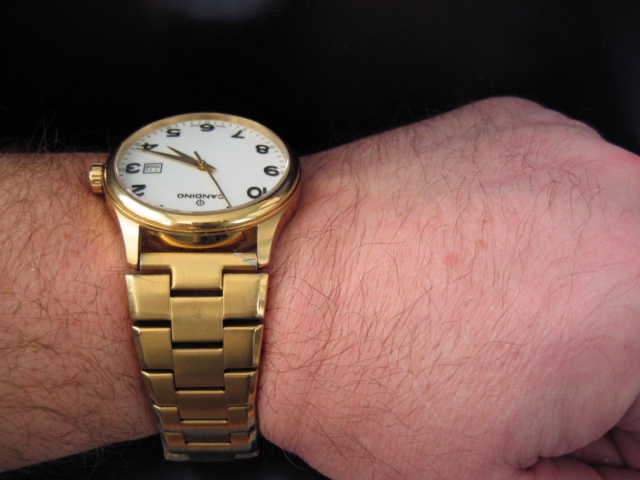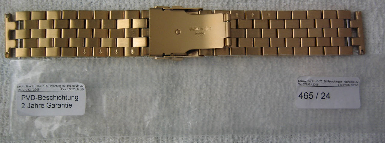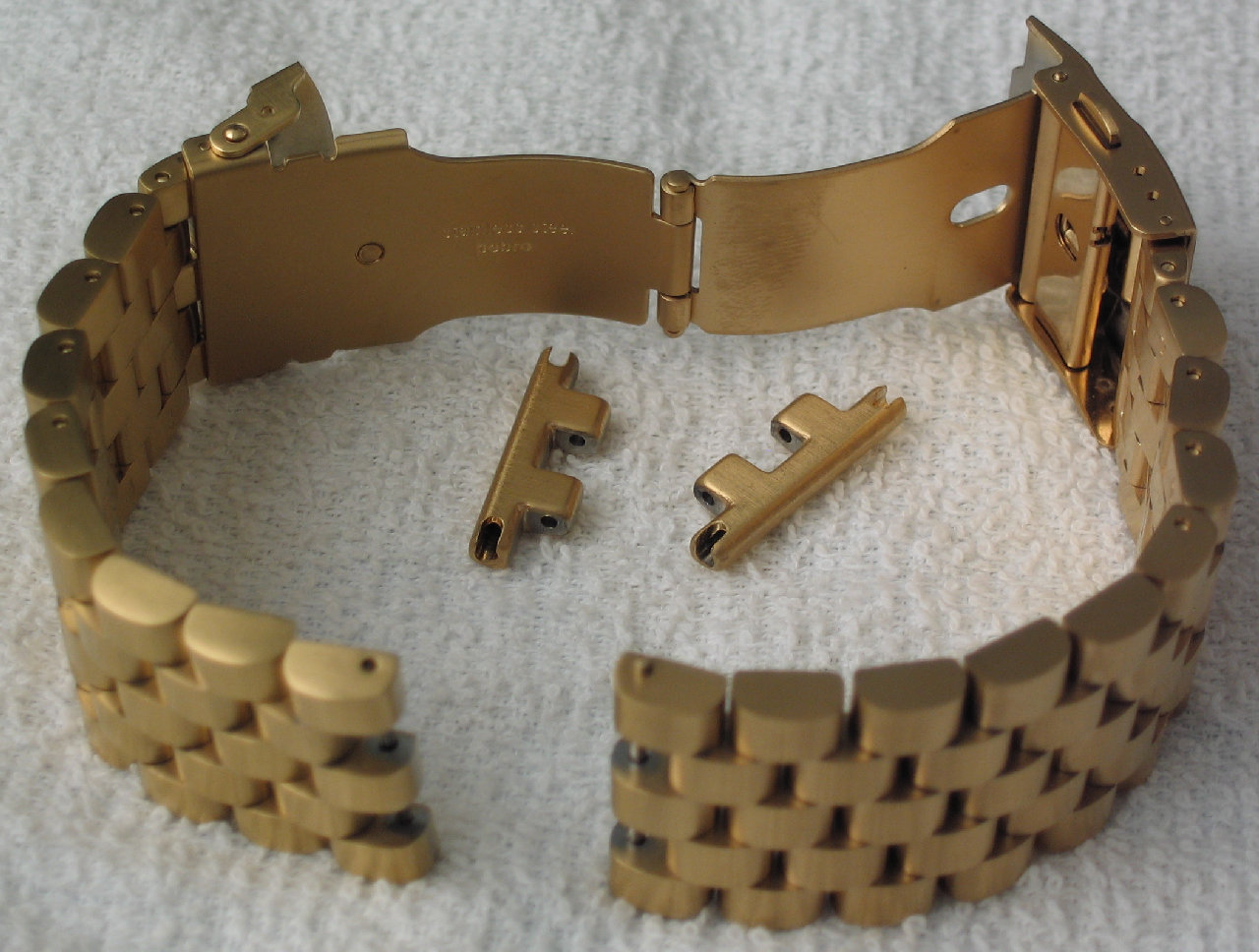 Вот с браслетами беда. Как я и ожидал, ничего подходящего нет, более того выбора тоже нет, если не брать в расчёт одноразовый китайский отстой за 400-600 рублей, который облазит буквально за месяц. После резинового и кожаного ремешков, наконец-то в одном ларьке удалось найти браслет за 2 тысячи рублей шириной 28мм, он оказался гнутым, ну да ладно, хоть сделан более-менее нормально. На время пока найду хороший браслет сойдёт с «горчичкой». Мастера искать было лень , решил сам его подправить под нужный размер. Взял дремель и сточил до 23мм конечные звенья. Получилось конечно по-колхозному, пару раз точило «срывалось» на сам браслет, оставив отметины, зато приобрёл опыт, как и что делать не надо. На фото часы с этим браслетом. Нормальные (вроде бы), литые браслеты заказал на watch-band-center.com 30 декабря, хотя и там, и вообще в инете выбор скуден, до безобразия, но куды деваться. Когда придут х.з., надеюсь, что в два месяца уложатся.