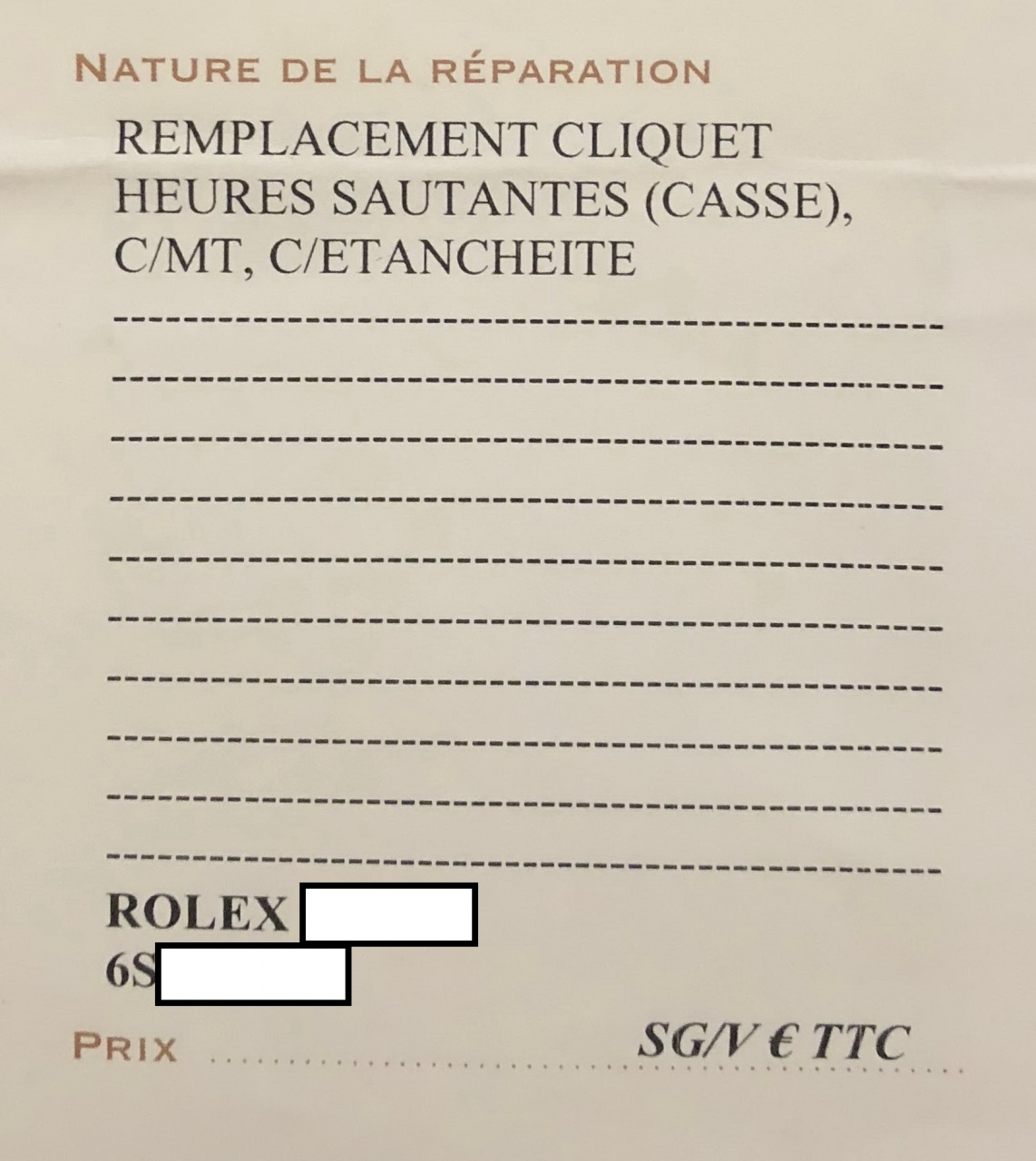 - Вы наш клиент, поэтому не смотря на то что часы вне гарантии, мы все сделали бесплатно. ЗАМЕНА (дословно - cliquet heures sautantes) - храповика, регулировка точности безеля. Всегда рады вас видеть у нас )