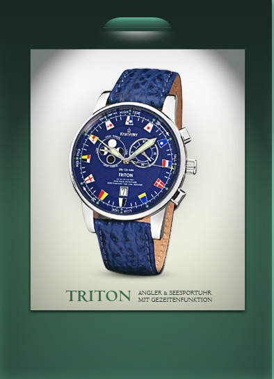 Серия Triton того же Kronsegler, также обладает всеми дизайнерскими признаками для образа "яхтсмена". Кварцевая швейцарская ISA8272 позволяет даже реализовать в этих часах некую полезность для любителей парусов в виде "усложнения" индикации приливов-отливов. Стекло, к сожалению, также минеральное, водонепроницаемость такая же символическая - 5 атм.