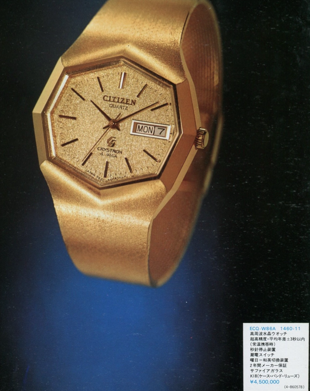 Первый же рисунок каталога это золотой CITIZEN 4 MEGA с умопомрачительным для японских часов ценником 4 500 000 йен! Ну типа покупайте наших слонов.