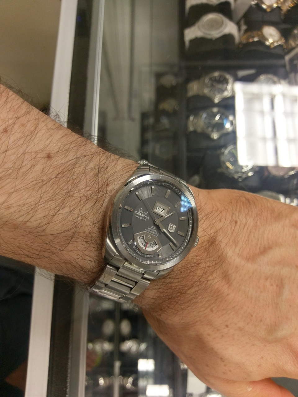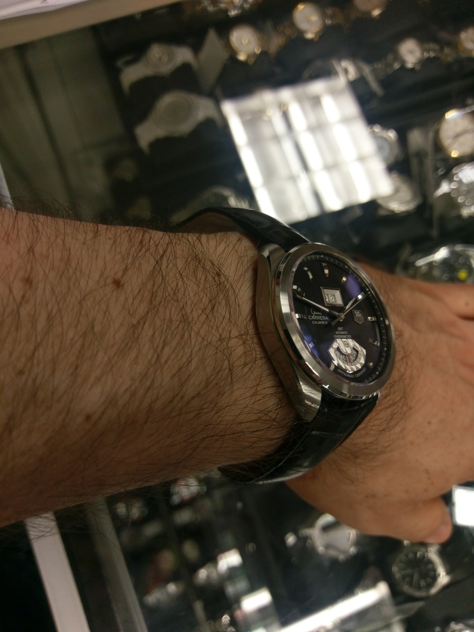 9. Памятуя наставления опытных товарищей относительно того, что стОит присмотреться к другим производителям, пользуясь случаем, попробовал примерить на руке давнешнюю свою мечту-Tag Heuer Grand Carrera Calibre 8rs gmt. Извините за оффтоп, но всегда считал эту модель одними из красивейших часов в доступном ценовом диапазоне.