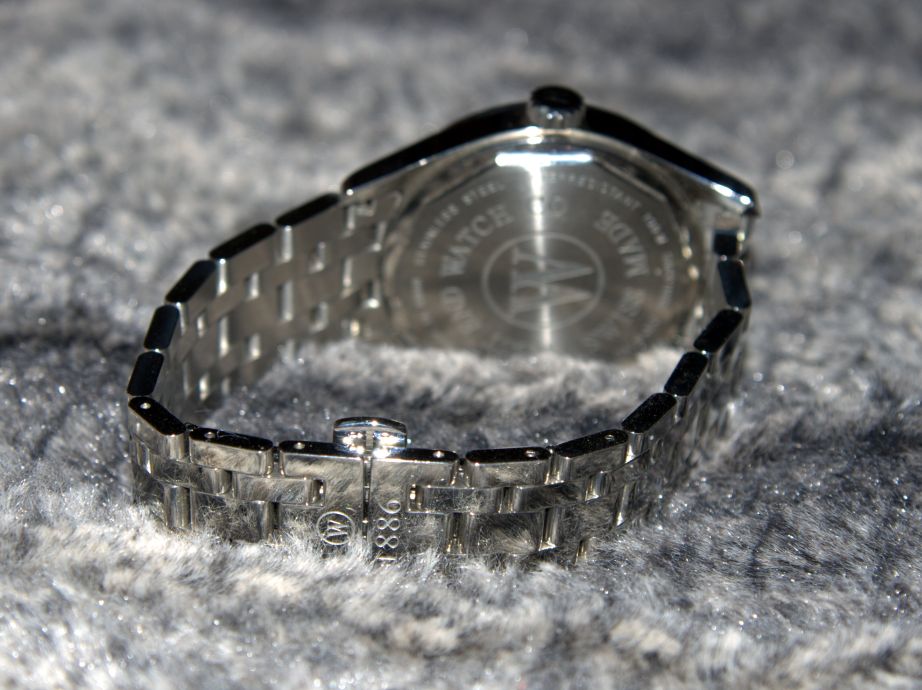 Браслет стальной, непохожий на клон "устричного". Застёжка с логотипом - буква W в кольце. Звенья наборные из 4 частей. Узкие "проставки" полированные, широкие части матовые.