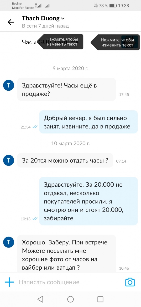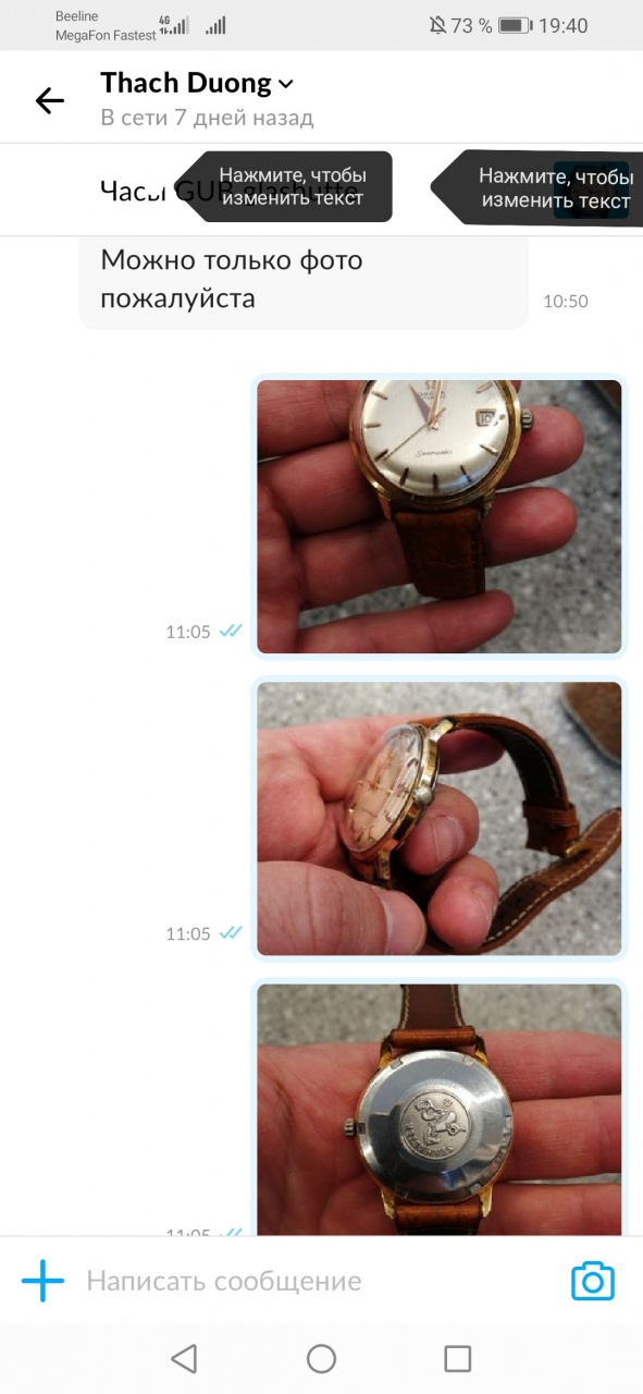 Если Вы видели эти часы на Авито, я продал за 20.000 рублей в прошлом месяце, то и знаете номер моего телефона. Может быть и мы разговаривали с Вами. Я выше отписал мне ЗВОНИЛИ, никто сообщения не писал, поэтому не могу сделать скриншот!!! Ещё какие вопросы??? Уважаемый 1suprastin1, я Вас не понимаю, директор какого большого предприятия, ищет какие то старинные винтажные часы, может как Вы говорили....Jaeger lecoultre tourbillon, Майбах, Самолёт, а что всему конец? из за карантина?
