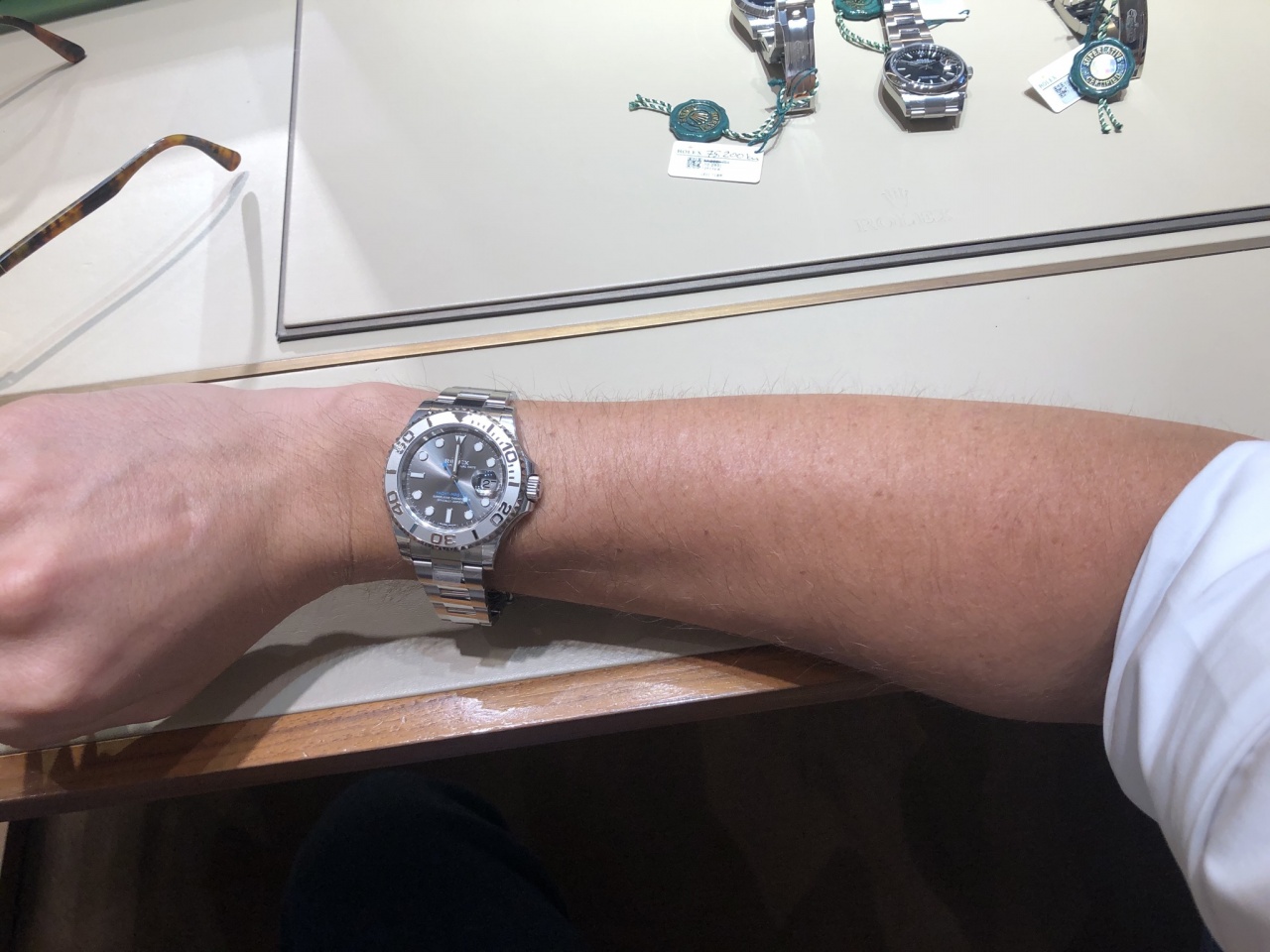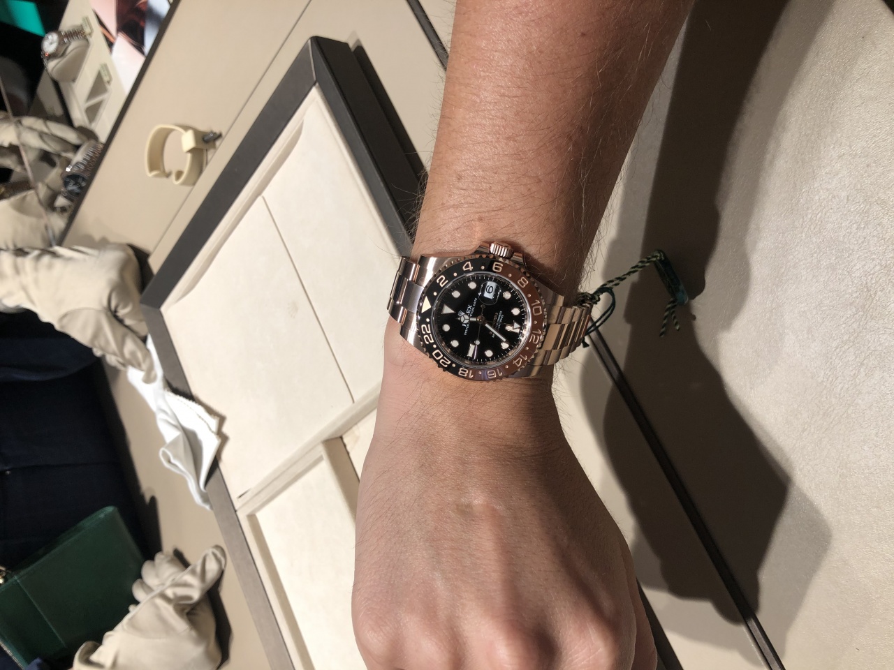 Из забавного. Примерил daytona yg с зеленым. И вот знаю, что хронограф мне и не нужен, и на каждый день вот вообще не нравится. Но выглядит она ну очень классно. Кстати, если кто искал, эта была не в резерве.