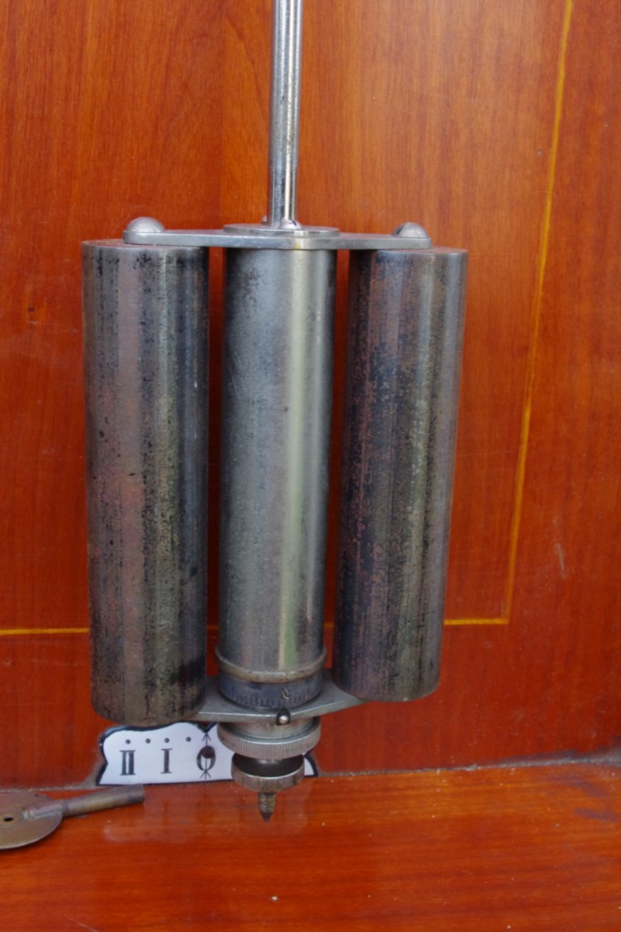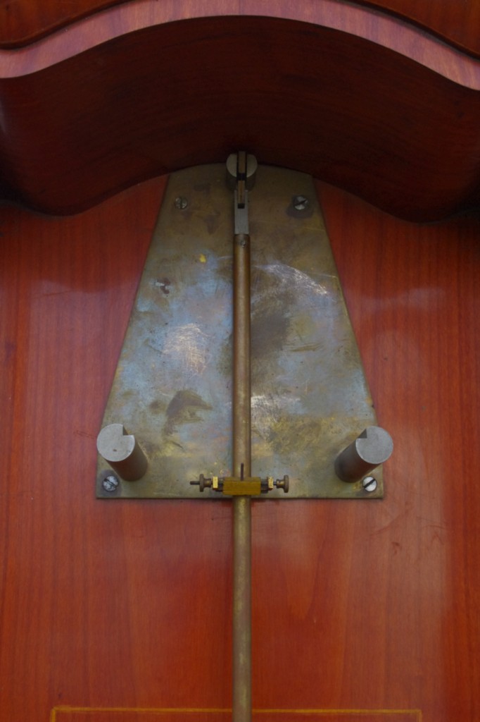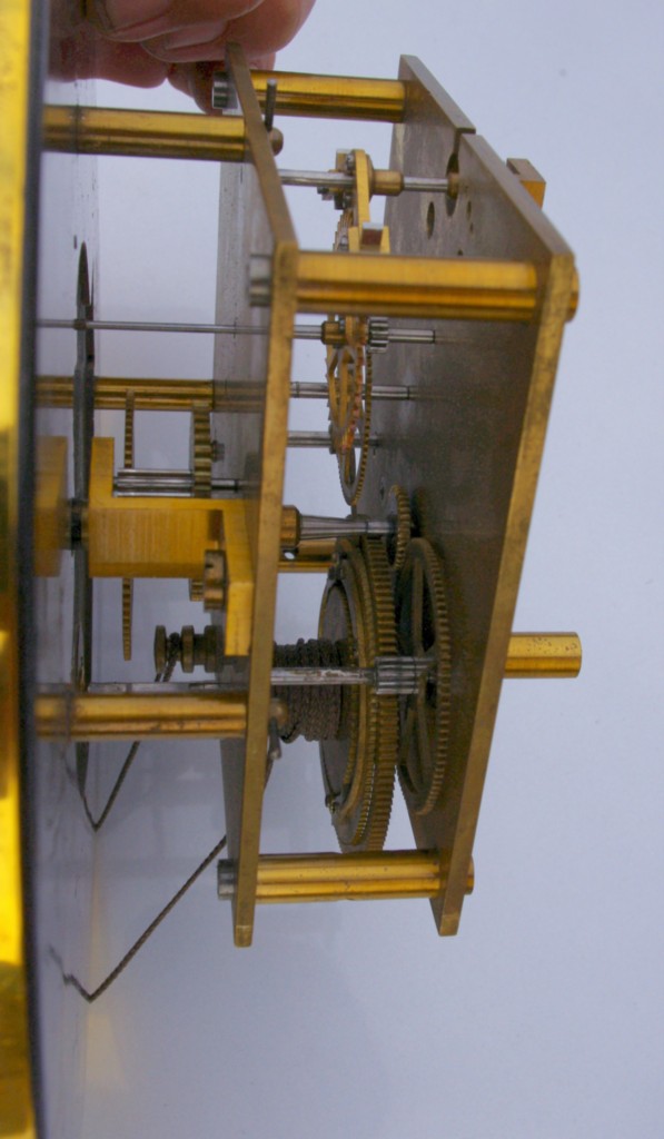 The design was based on automatically winding the clock each hour with a motor powered by two 1 1/2-volt dry cells located in the case. The advantage of his high-quality, pendulum-controlled movement, combined with the constant driving force of the small, frequently wound mainspring, was that it yielded a highly accurate clock subject to minimal wear.