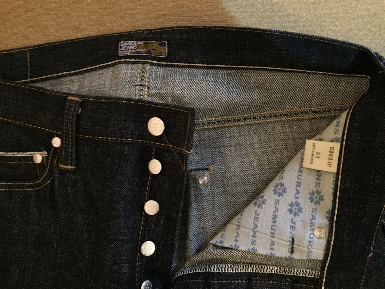 Уже и не помню, может и по более 2-х лет назад стал обладателем Samurai jeans s003jp yamato в 15oz w34 non wash … но сначала не доходили ноги-руки до них … да и перед ними в очереди стояли тоже достойные представители япов … а потом как в подтверждение тому, что человек предполагает, а бог располагает,- пришлось перейти в другую весовую категорию … на момент покупки был 191см\88кг потом снижение веса (при том что рост как понимаете никуда не делся, а так бы вообще было безумно увлекательно) и после пике вес выровнялся на уровне 74кг … и помятуя как они сырыми сидели на мне в свое время, сейчас я долго сомневался сядут ли комфортно, даже были попытки продать, но не срослось … в общем читая на днях форум почувствовал знакомый зуд и так как под рукой другого сырого денима не было, а зуд все не унимался, быстро оторвал все бумаги и сунул сомы в воду, сначала просто замочив, а наутро в стиралку на деликатном при 40гр. Во время примерки понял, что слишком свободновато как то, даже загрустил … посоветовался с одним из наших братьев, высказав ему свои хотелки-мечталки и решил замочить их еще раз и погорячее, в общем опять стиралка, но при 60 гр с и с отжимом 900 об. Без распорки так как все-таки 15 унций и был уверен, что потянутся в поясе. Не ошибся. В общем на выходе получил более плотную посадку и сегодня же решил их выгулять. Результат на фото. Более плотная посадка была бы не комфортной точно, так что решил оставить и носить пока погода позволяет, а там видно будет. Деним стал мягким, хотя из коробки просто коржик был. … 60 гр патч не испортили, а вот подкладка карманов немного взяла на себя индиго. Вот такие первые впечатления. Замеры выложу в соответствующий раздел.