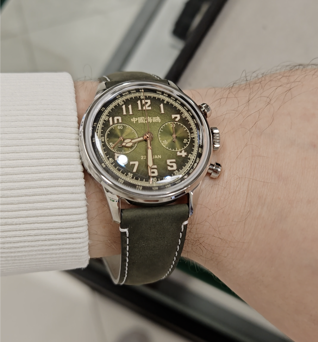Сходил в Bestwatch посмотреть на Seagull Aviation 819.93.2023, очень хорошая цена них. Циферблат, оттенки зеленого, цифры и стрелки - "шик,блеск,красота", очень красиво все сделано. Высокий купольный сапфир с антибликом нивелирует высоту в 14мм. Механизм чуть лучше декорирован, чем в стандартных 1963 с АЛИ за 15-20 тыс.