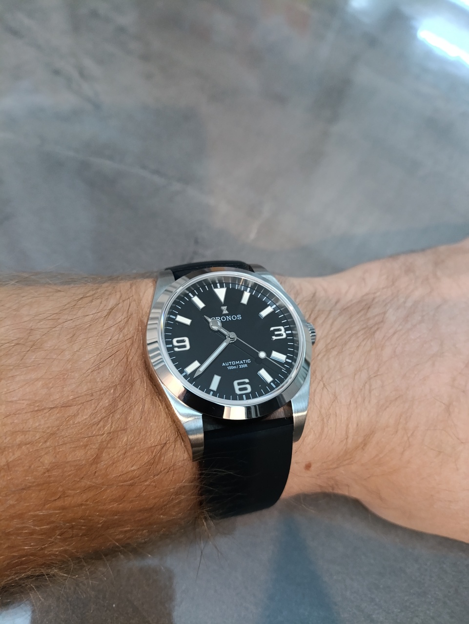 Даже довольно убогий накладной логотипчик не особо раздражает ввиду своих крошечных размеров. И да, он симметричен относительно надписи cronos. Люм на метках и стрелках оказался желтее, чем предполагалось, но хотя-бы везде одного тона. Светит отменно. Недорослая и худосочная часовая стрелка тоже особого отторжения не вызывает. Размер 39мм - прекрасно подходит на запястье 17-18 см. Хорошо что не взял 36. На браслете ещё было-бы в натяг, на ремешке смотрелись-бы совсем крошечно.