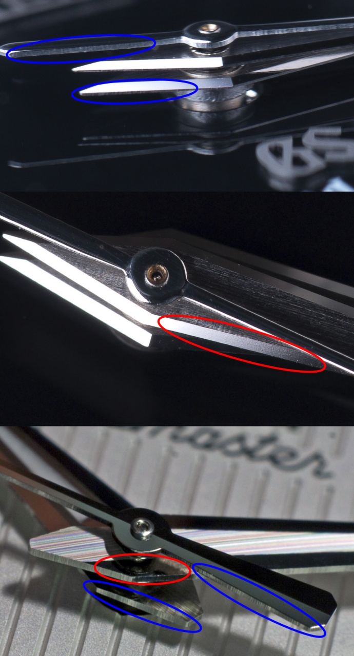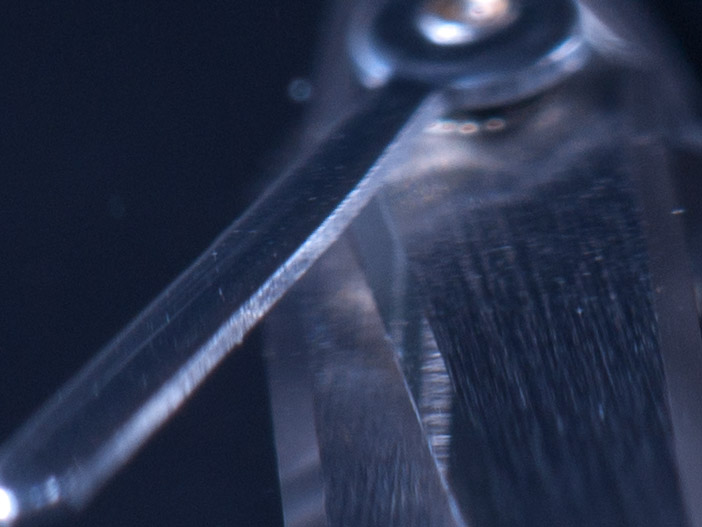 Ну уж будьте немного объективными что-ли. Что значит не заполировали как надо? Размер этой фаски представляете себе? Толщина стрелки около 0,2 мм. Ширина фаски примерно такая же, 0,2 мм. Она отполирована так что "горит" от малейшего света, ловит блики от самых слабых источников света. Естественно, при таком увеличении вылезут неровности поверхности