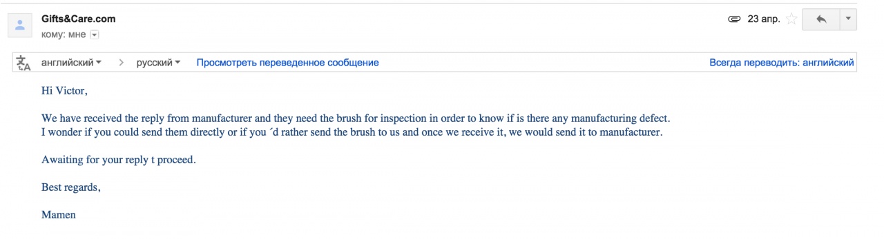 что они поставили производителя в известность и он просит прислать помазок обратно.После чего отправил им "маленького Симпсона".