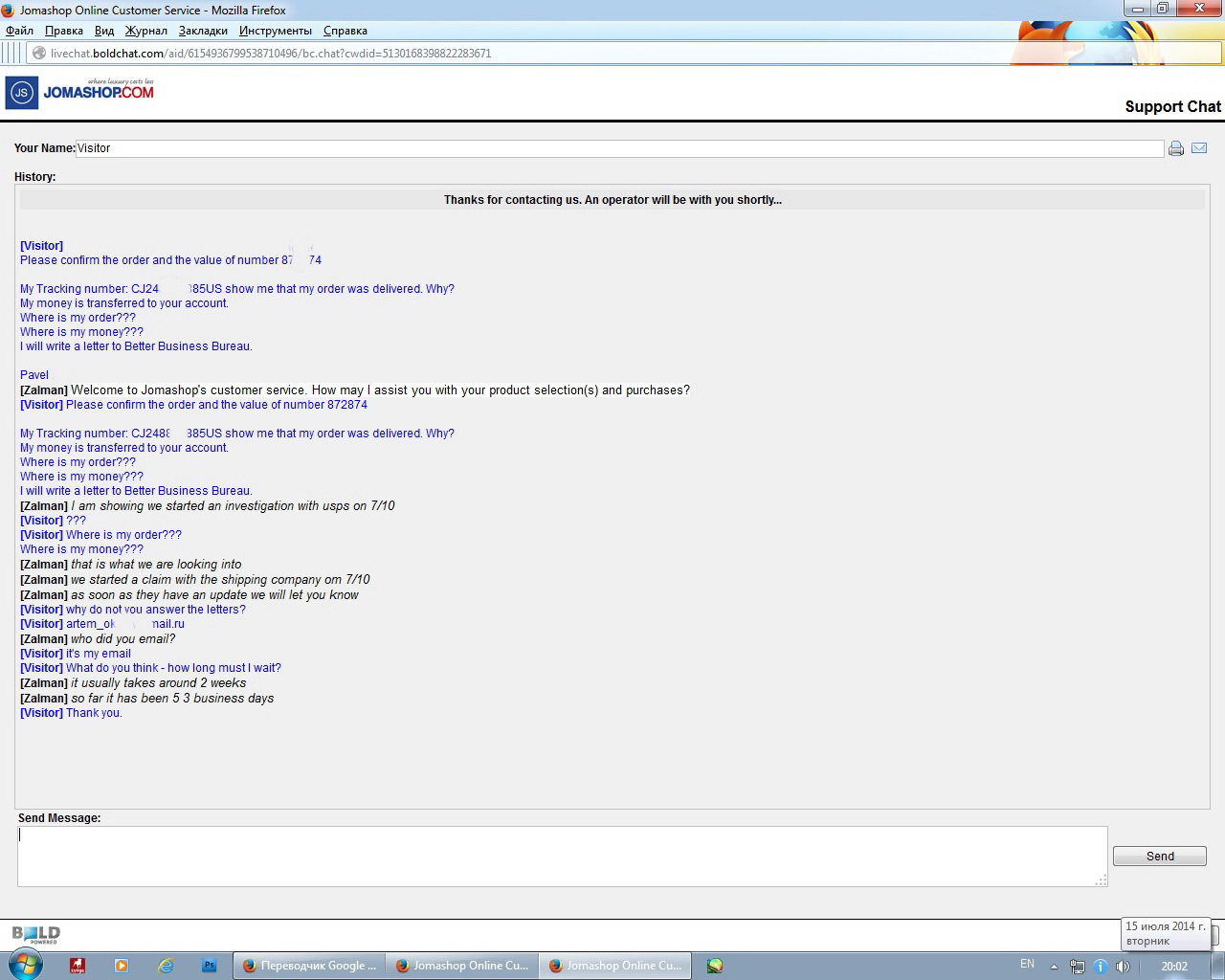 15.07.14 написал в чат, при этом указал что буду жаловаться в Better Business Bureau -