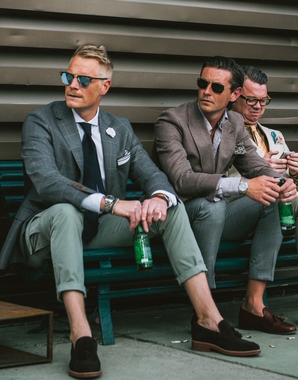 Ткань и цвет здесь вообще не играют роли. С таким подходом рассуждений все неформальное превращается в праздник жизни и театральный маскарад. Двубортный костюм, и батона в том числе, всегда смотрится более нарядным одеянием, чем костюм протокольного мероприятия, когда сам становишься похож на безликого телохранителя. Но торжество можно превратить в цыганский разгул, надев тапки-лоферы, вместо ботинок на шнурках с двубортным костюмом, который по исполнению достаточно строг. Торжественность наряда задает тон, и привольность трактовки надевать что попало под такой верх, это либо голова совсем не работает, либо полная безбашенность. Дай волю Динь-Диню, он всех нарядит в рваные штаны, вьетнамки на веревках и соломенную шляпу, с ореолом обитания на пляже.