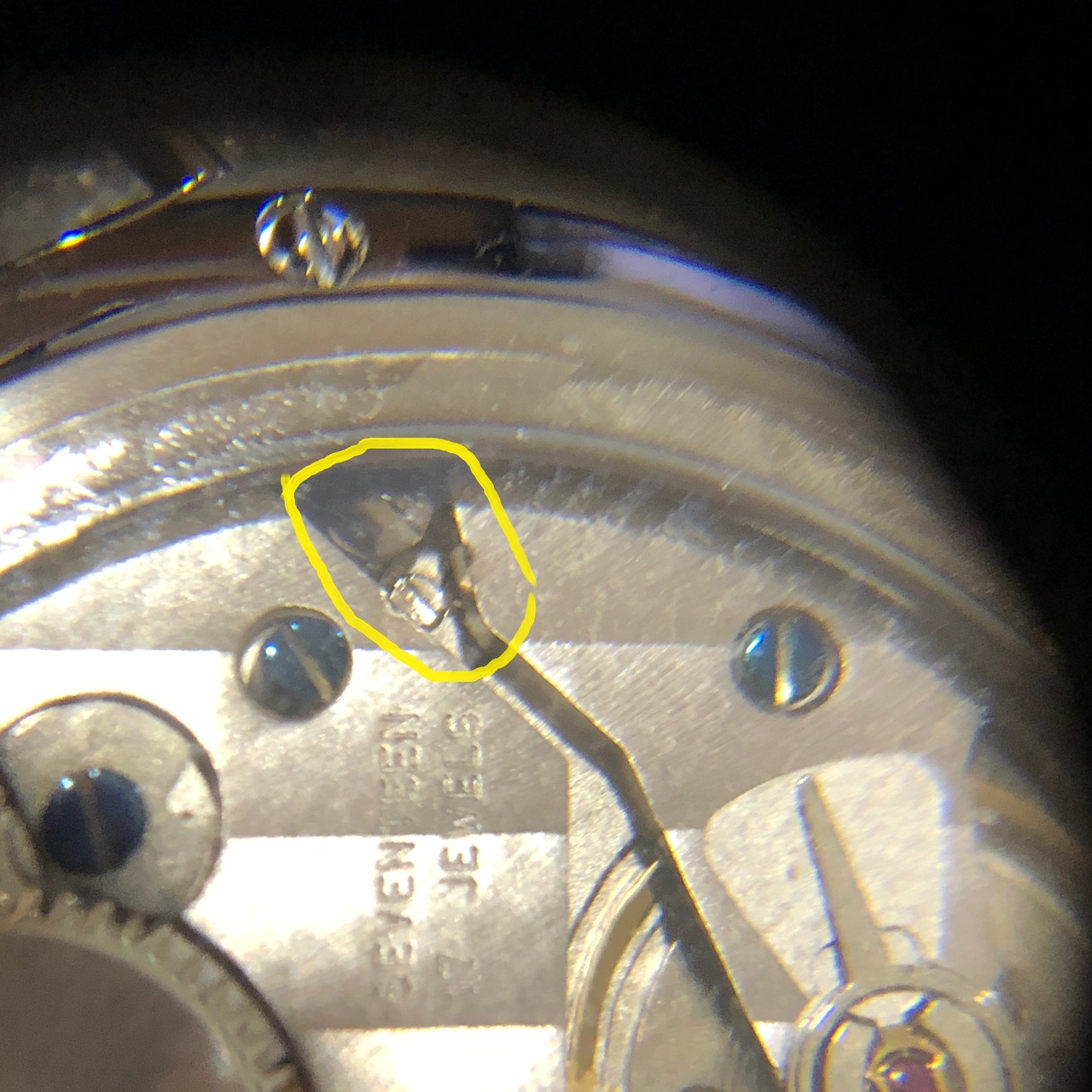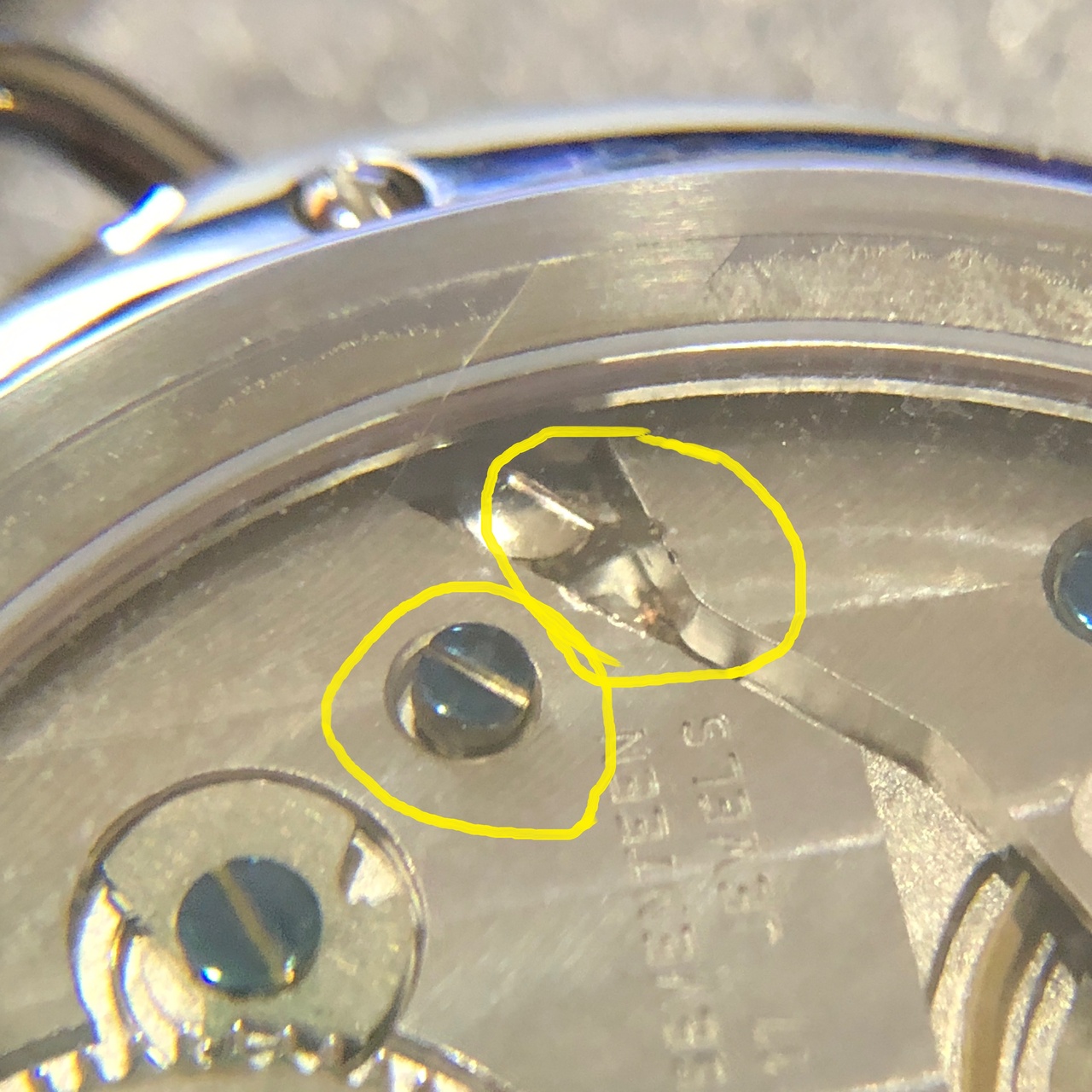 Сами часы: загнут вал ЗГ. Внутри откручен винт. В местах закручивания винта задраны прям края инструментом. Я уж не знаю какой там супер мастер делал, но на фото то что есть. Выводы делайте, кто разбирается.