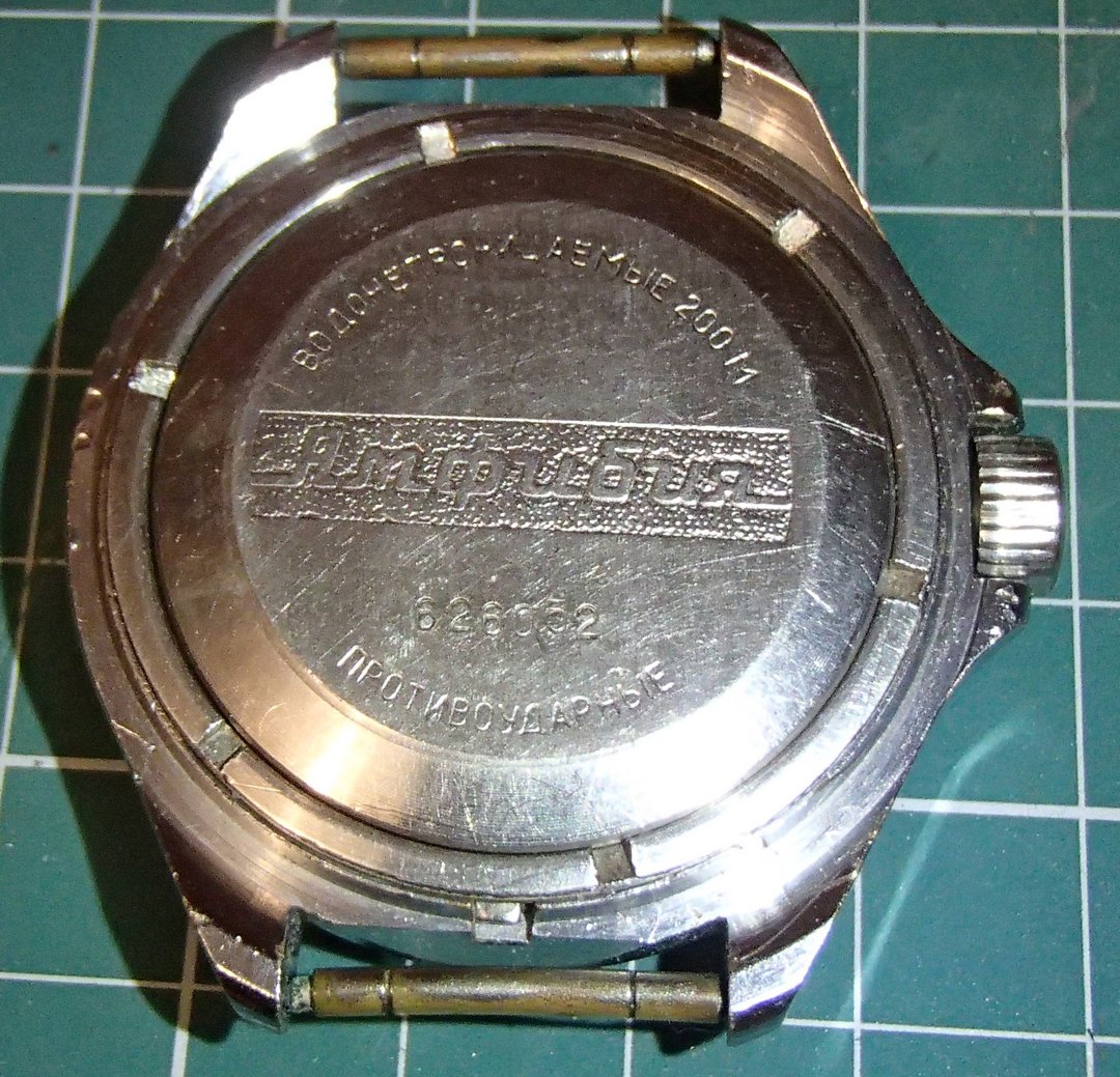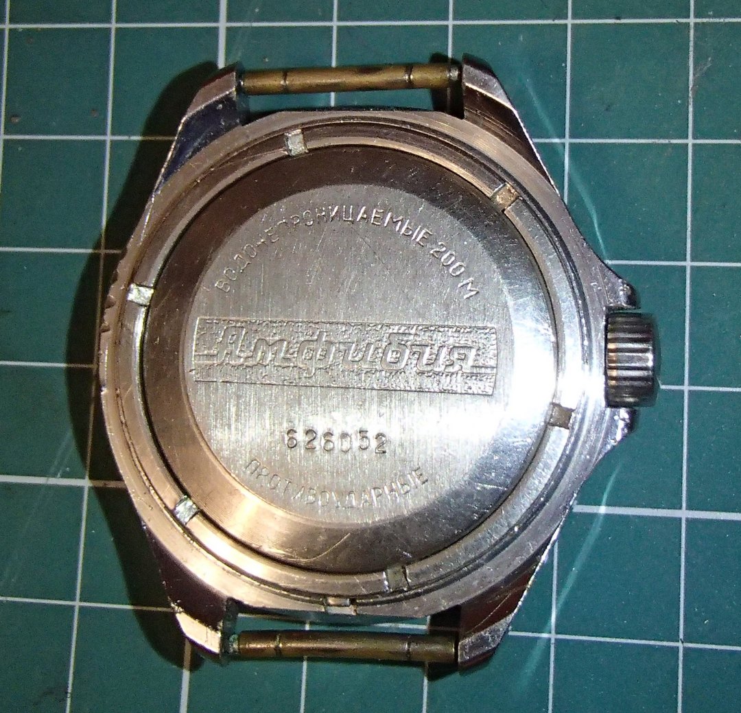 Странно, но на крышке спилена вторая пимпочка. Именно спилена, ибо она там была, заусенец остался. На корпусе нет второго углубления. Странно, нетипично для амфибий? и при этом все таки стальной корпус (нет следов потертостей, на сколах не видно ничего "желтенького").