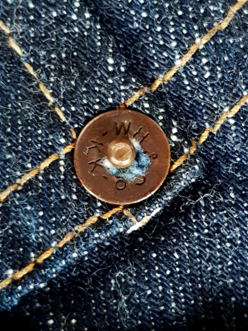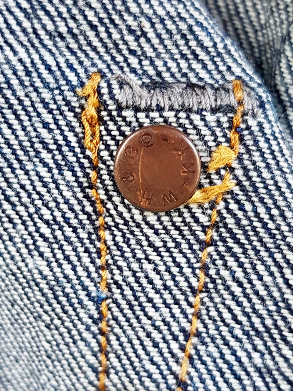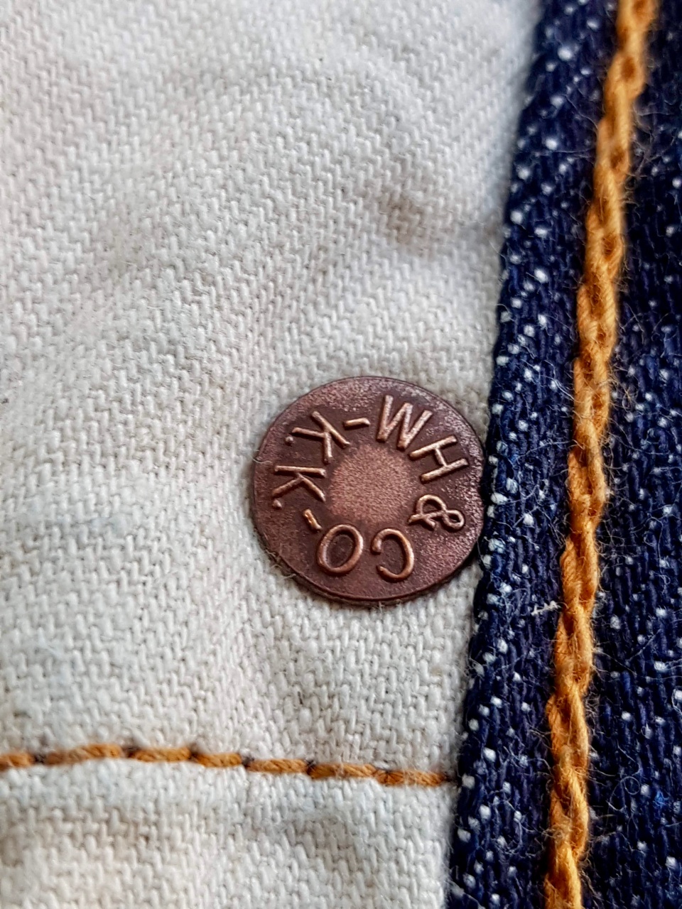 Санфоризованный 13,5 унцовый денимчик оказался совсем даже неплох .... порадовал волосатостью и тактильной мягкостью . Окрас густой насыщенный . Фактурно спокойный , без явно выраженных непрорядков .... в кромку вплетена фирменная желтая нить . Насколько я понял , деним собран из смеси хлопка из трёх штатов США ( Memphis Cotton) .