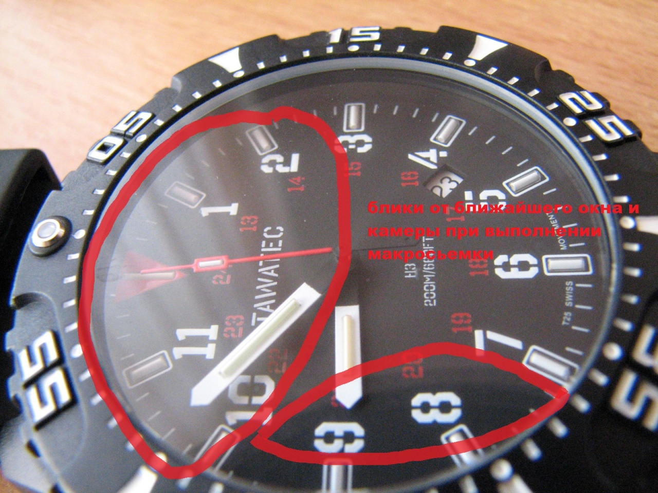 После 3 недель на руке часы практически не ощущаю. Об косяки бил, работал с молотком, в пейнтбол несколько игр отбегал (без прямых попаданий в стекло, но о корпус шары кололись пару раз, метров так с 25), в ванной лежал, ежедневно в душ не снимаю. Ничего, идут как шли. Радует, то циферблат не содержит никаких ненужных украшательств, кроме названия фирмы (оно же – логотип). Из-за этого не хотел ни УЗИ (крылья), не Преториан (с их скорпионом), ни Люминоксы (не люблю этот щит). Очень правильным решением в этих часах по сравнению с титановой моделью (где все цифры - белым) считаю решение фирмы сделать внутренний круг с метками от 13 до 24 темно-красным цветом: цифры становятся почти не видны, и на фоне белых стрелок основные цифры резко контрастируют, глаз схватывает это сочетание белый-белый, и не отвлекается на мелкий внутренний круг. Колбы с тритием светят ровно настолько, чтобы в темноте увидеть время, и создают на матовом столе от часов в радиусе 5-7см слабое, но ясно видимое свечение голубого цвета. В полной темноте на расстоянии примерно вытянутой руки отчетливо видны окружающие предметы, так что правы те, кто писал про ПНВ – похоже, «подсвеченная» фигура будет демаскирована и через обычную оптику. Если сравнивать с суперлюминовой, то яркость примерно одинаковая.. может, тригалайты чуть-чуть ярче, но это если суперлюм перед этим не подсвечивать специально ярким источником света. Считываемость просто прекрасная. Нравится, что колбы в дневном свете молочно-белые, а не фиолетво-синие. Если сильно придираться, то разница в цвете есть только на «тактических» колбах стрелок, где они бело-бежевая и слегка зеленоватая, но это если очень сильно придираться.