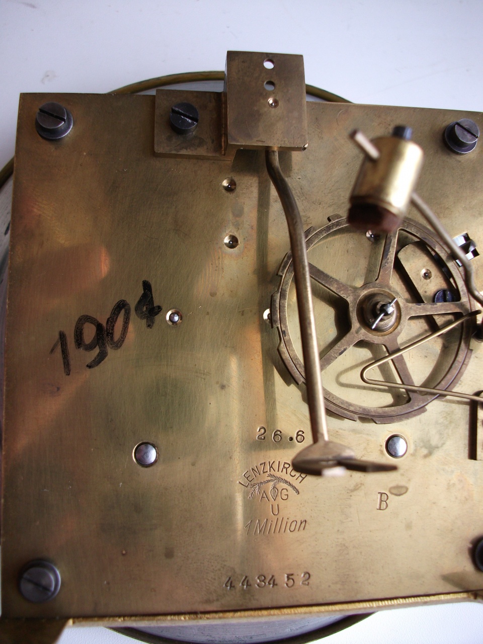 4) Одним из уникальных и безошибочных средств к датировке механизмов Ленцкирх является тип скрепления платин - судя по моей базе, шплинты были заменены винтами начиная с ~1 миллион 370-тысячного номера, что примерно соответствует 1903 году (см фото 4).