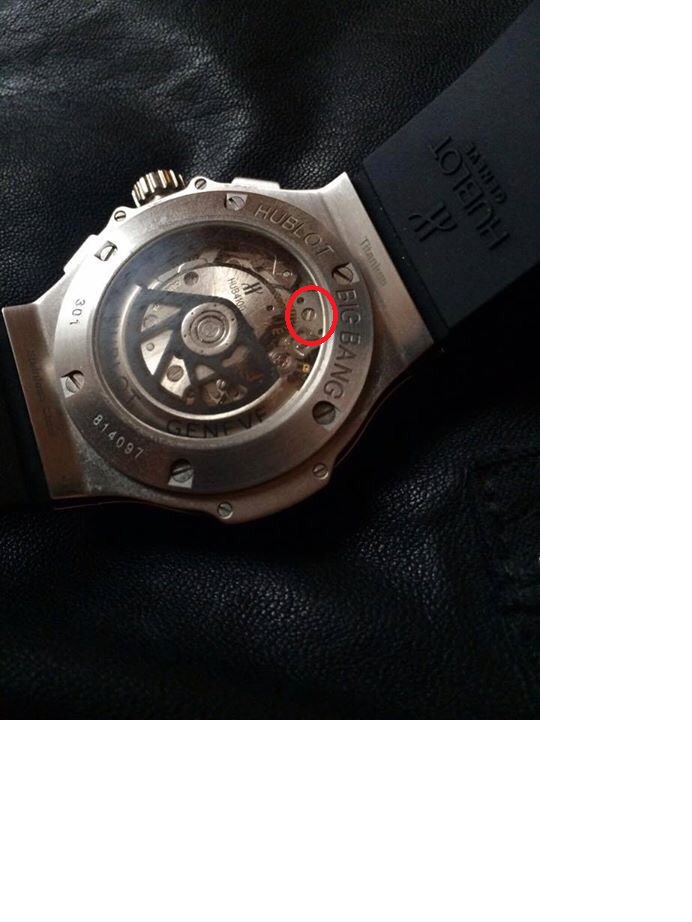 Сей факт совсем не очевиден, т.к. подделка действительно очень точная (во всяком случае на фотографиях), но, тем не менее, исходя из того, что я нашел- различия в том, что не должно быть шпилек на площадке, указанной красным овалом на фотографии. К сожалению найти фотографию этого механизма в оригинале мне не удалось (может быть, кто-то сможет это сделать из форумчан), но есть видео на сайте убло, где четко видны (а точнее не видны) эти шпильки (видео в разделе collection- big bang). Так же, насколько я понял, данная копия отличается безелем, а именно неправильным количеством рядов выступающих шероховатых квадратиков, и качеством исполнения винтов (кстати, на фото видно, что они немного неровные, но возможно это из-за низкого разрешения). Конечно же эти недостатки можно изменить, поставив оригинальный безель с винтами, и тогда, судя по всему, определить подделку будет действительно практически невозможно...