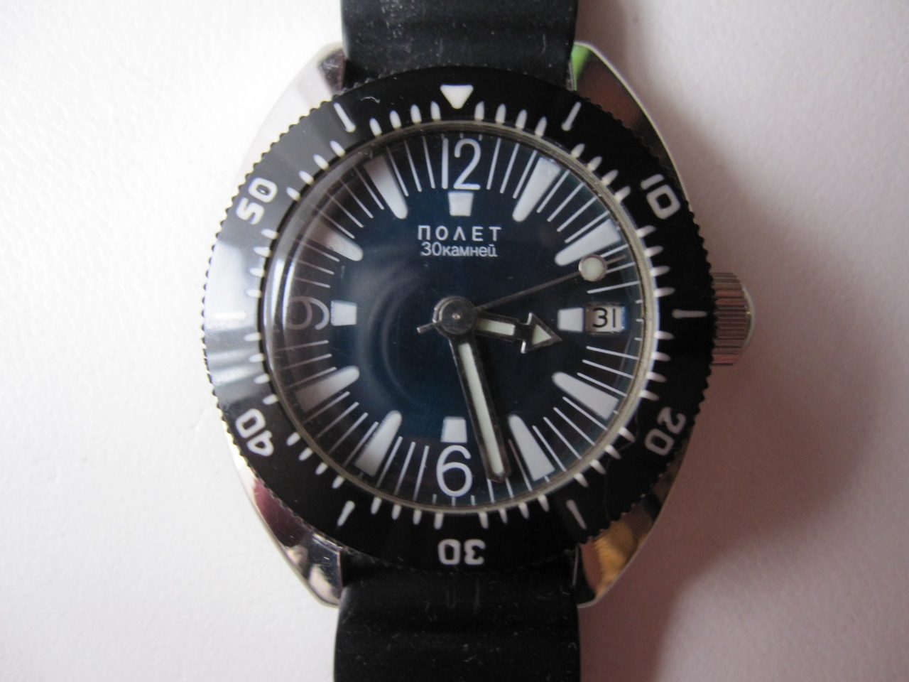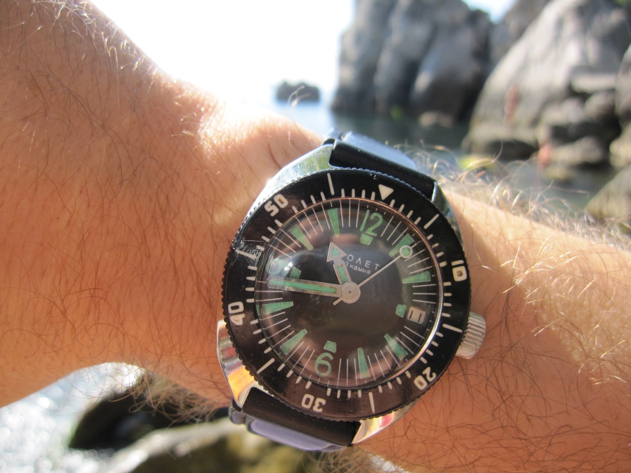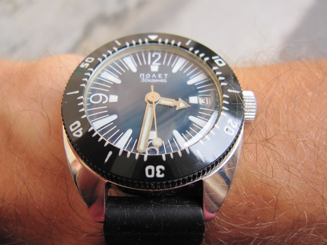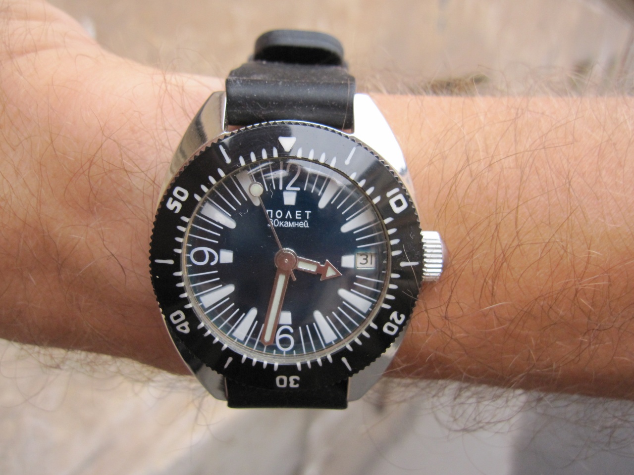 Лето близится к завершению и пора выложить отчёт о Полёт-амфибия 23 камня. Итак...взял часы из не лучших,(в случае чего не так жалко будет) т.е. корпус отдавал в полировку, безель поставил самый убитый, цифер , стрелки и механизм тоже не первой свежести. Нет, часы прекрасно работают но внешний вид уступает всем другим моим полётам-амфибиям. Носил их мало т.к. были абсолютно не герметичны. Причина оказалась в стекле, именно через него часы пропускали воду. Пришлось в мастерской проклеивать. Затем на приборе проверил часы - давление в 6АТМ выдержали без проблем. Ну и поехали на море...