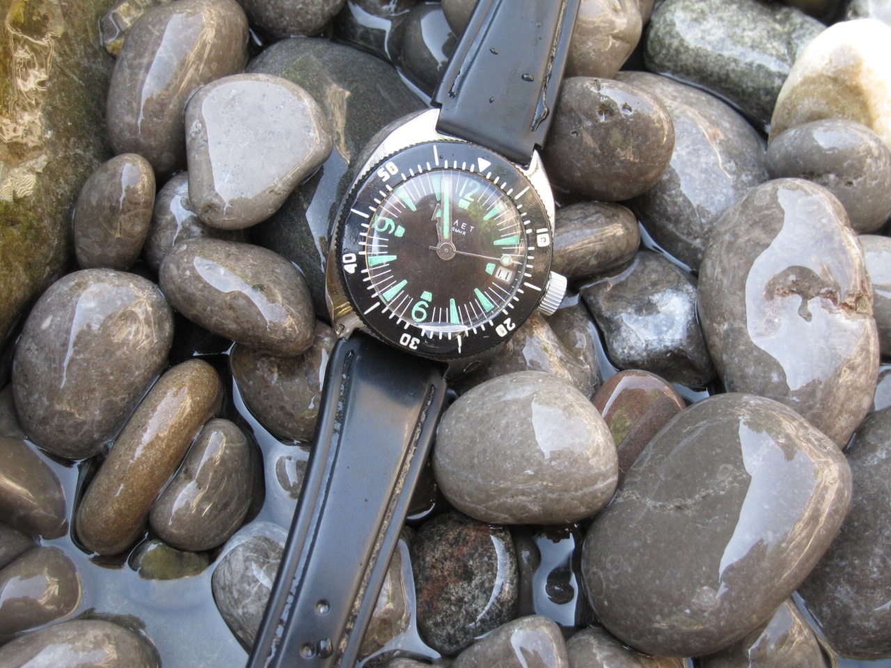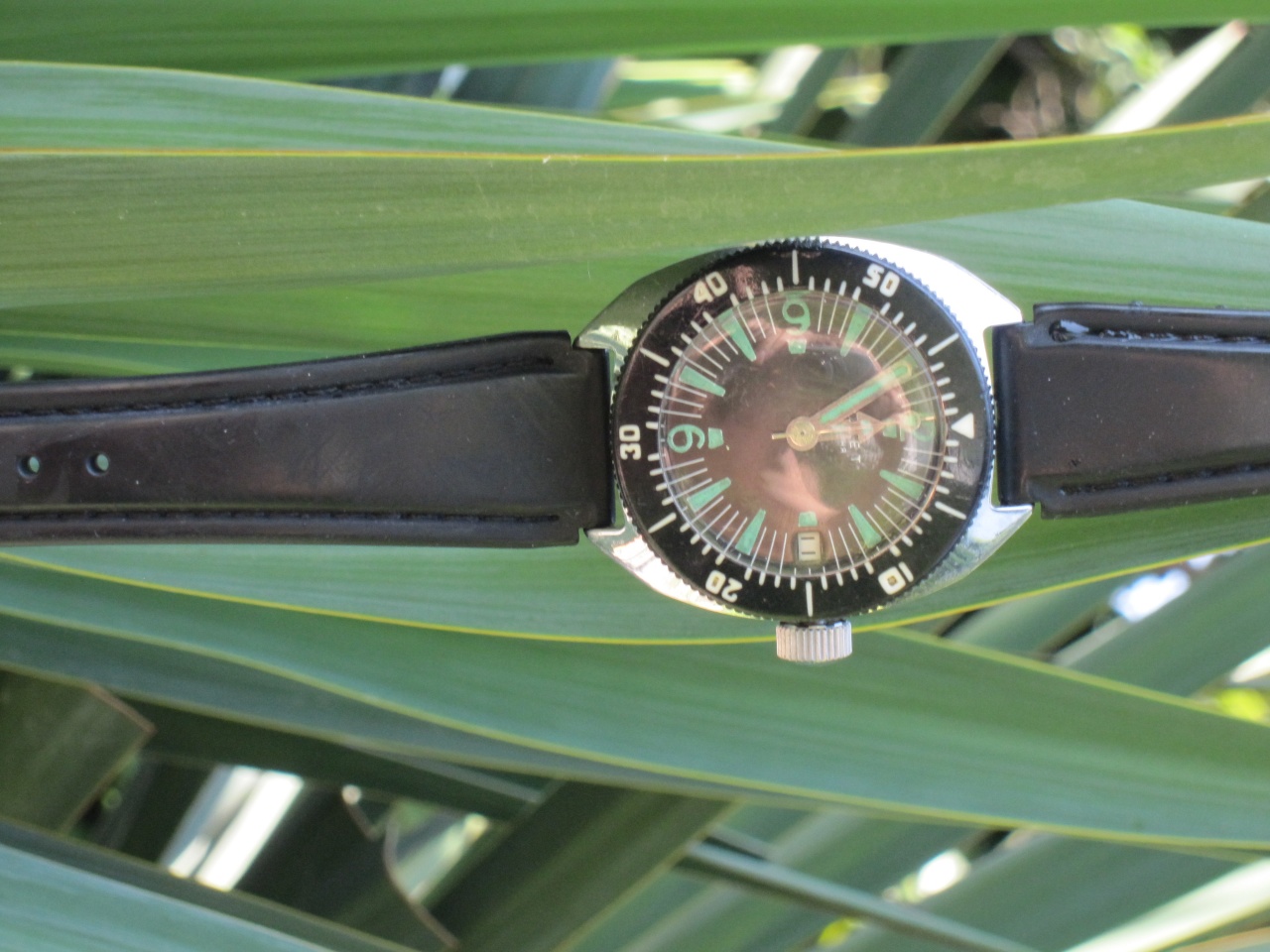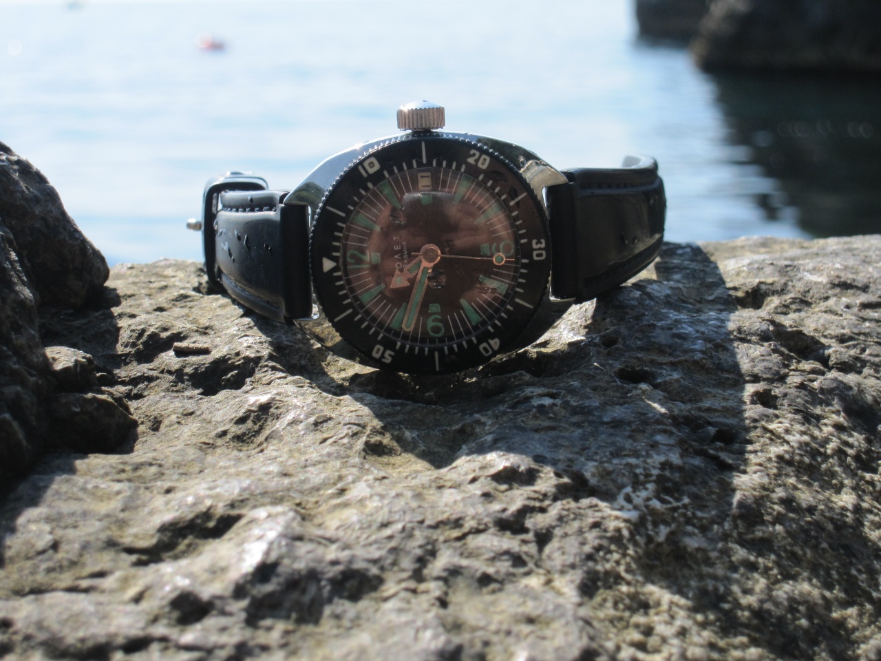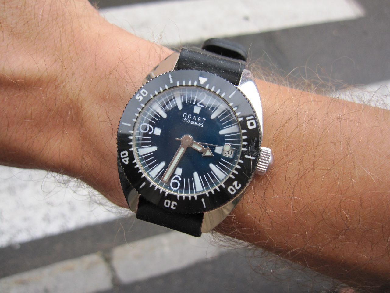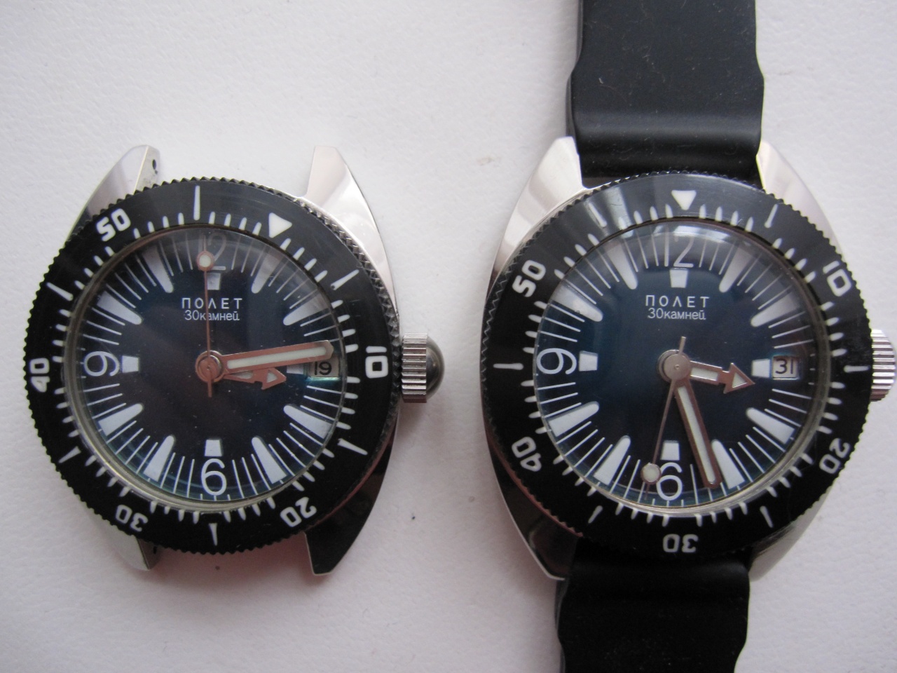 Лето близится к завершению и пора выложить отчёт о Полёт-амфибия 23 камня. Итак...взял часы из не лучших,(в случае чего не так жалко будет) т.е. корпус отдавал в полировку, безель поставил самый убитый, цифер , стрелки и механизм тоже не первой свежести. Нет, часы прекрасно работают но внешний вид уступает всем другим моим полётам-амфибиям. Носил их мало т.к. были абсолютно не герметичны. Причина оказалась в стекле, именно через него часы пропускали воду. Пришлось в мастерской проклеивать. Затем на приборе проверил часы - давление в 6АТМ выдержали без проблем. Ну и поехали на море...
