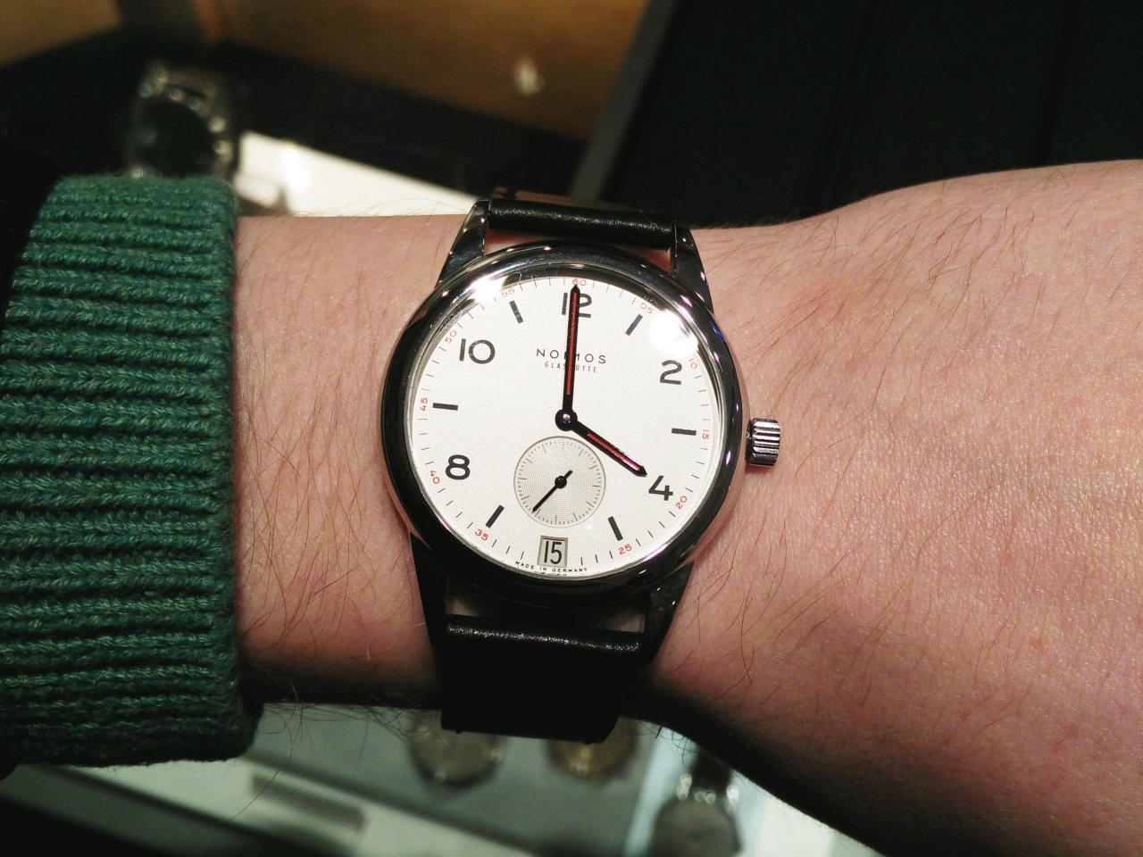 Мерял Nomos Metro, 37мм на ручке(1.5мм меньше Club Datum выше). У них интересная форма корпуса, похожи на таблетку. Выглядят вкусно вобщем. У них цветные маркеры, были как раз в цвет кофты. Классно, но я себя с такими часами не вижу: надо быть худым хипстером в обтягивающих джинсах.