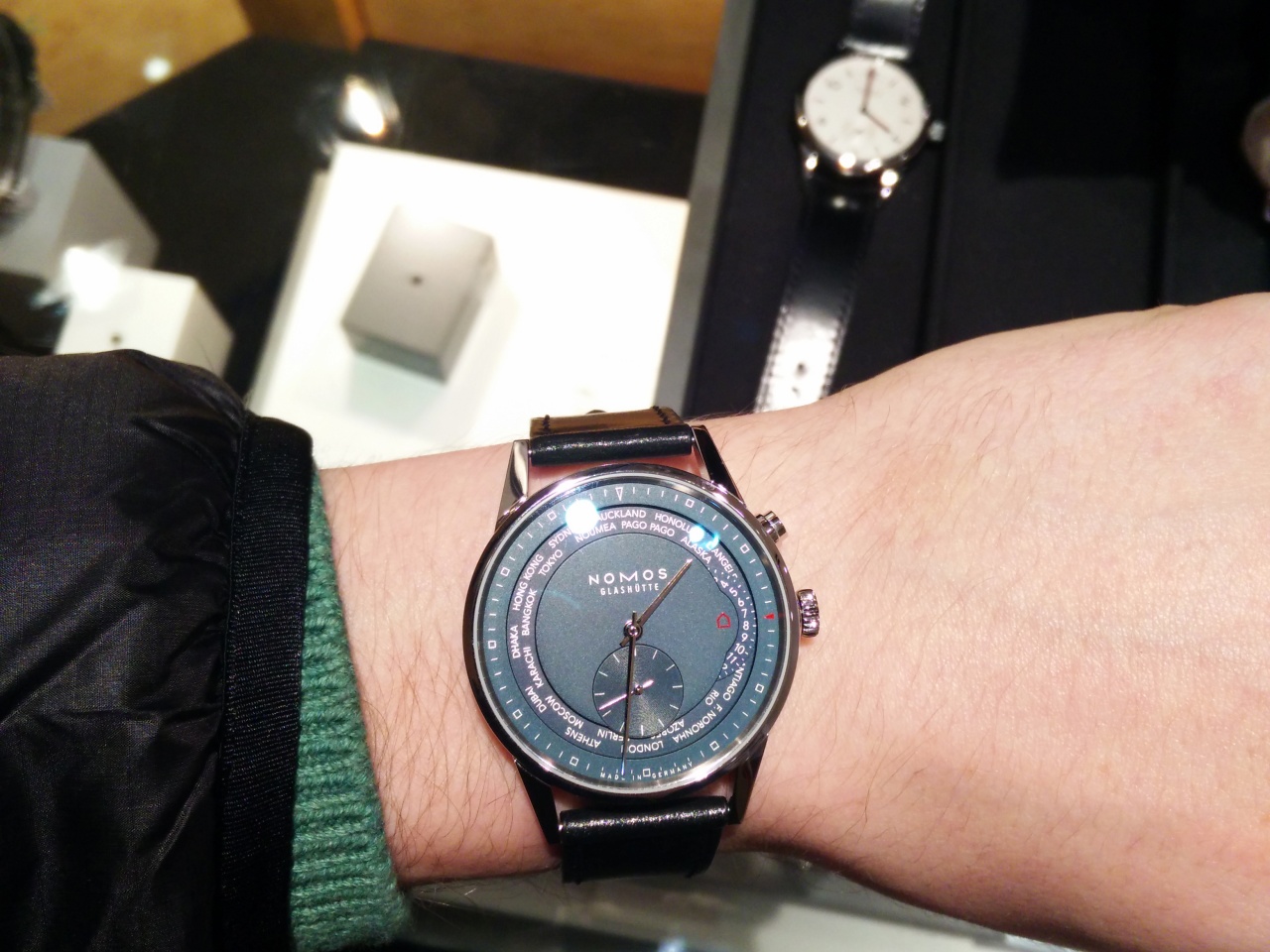 Сходил, посмотрел. Вот фото, Nomos Club Datum и Zurich Worldtimer: