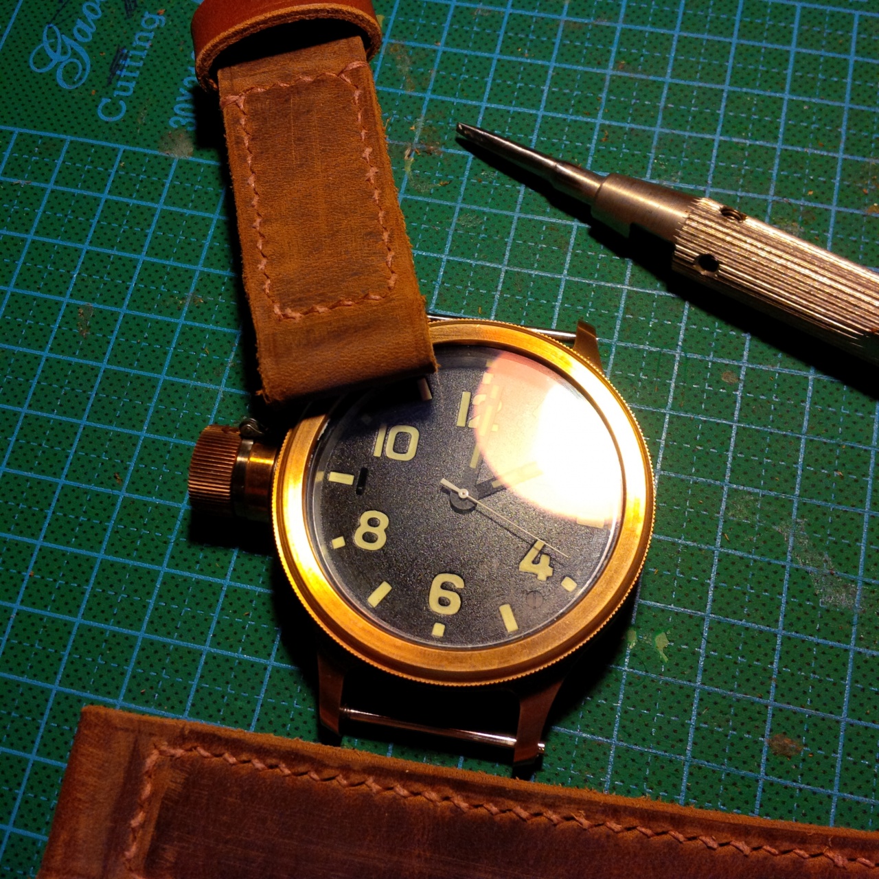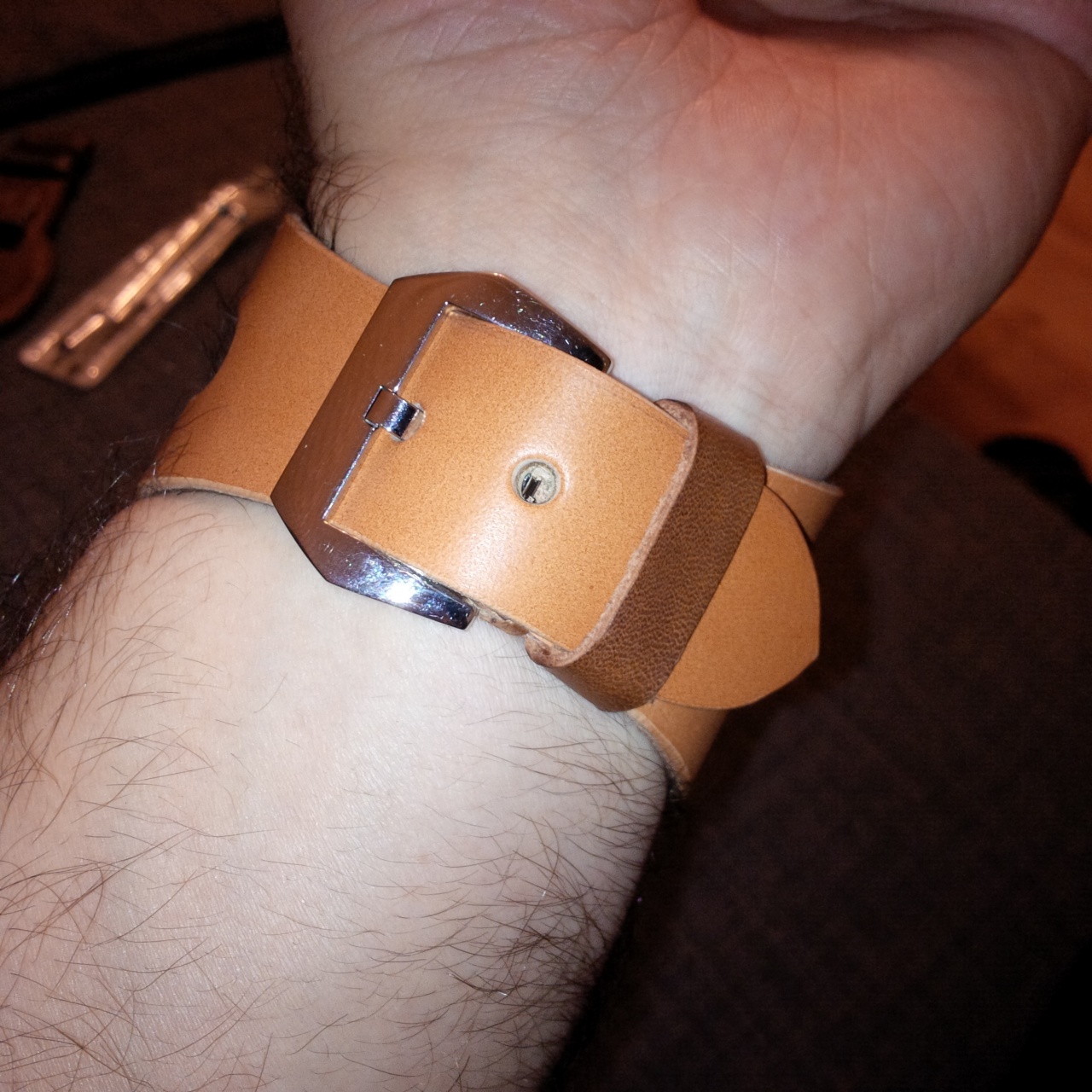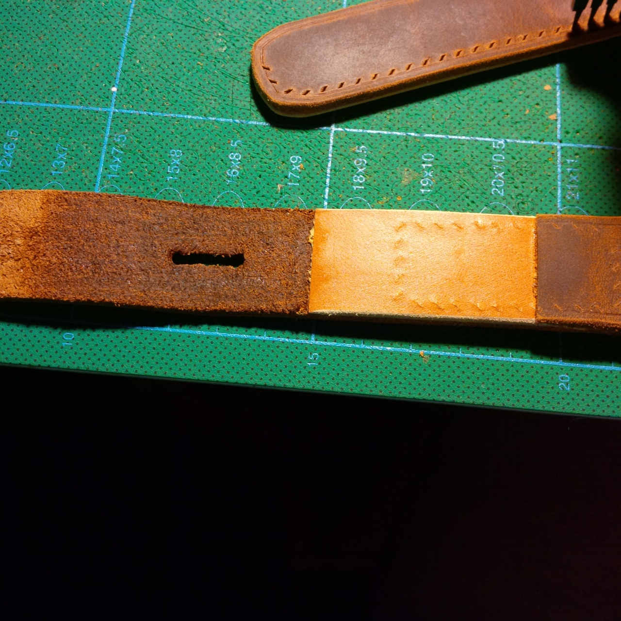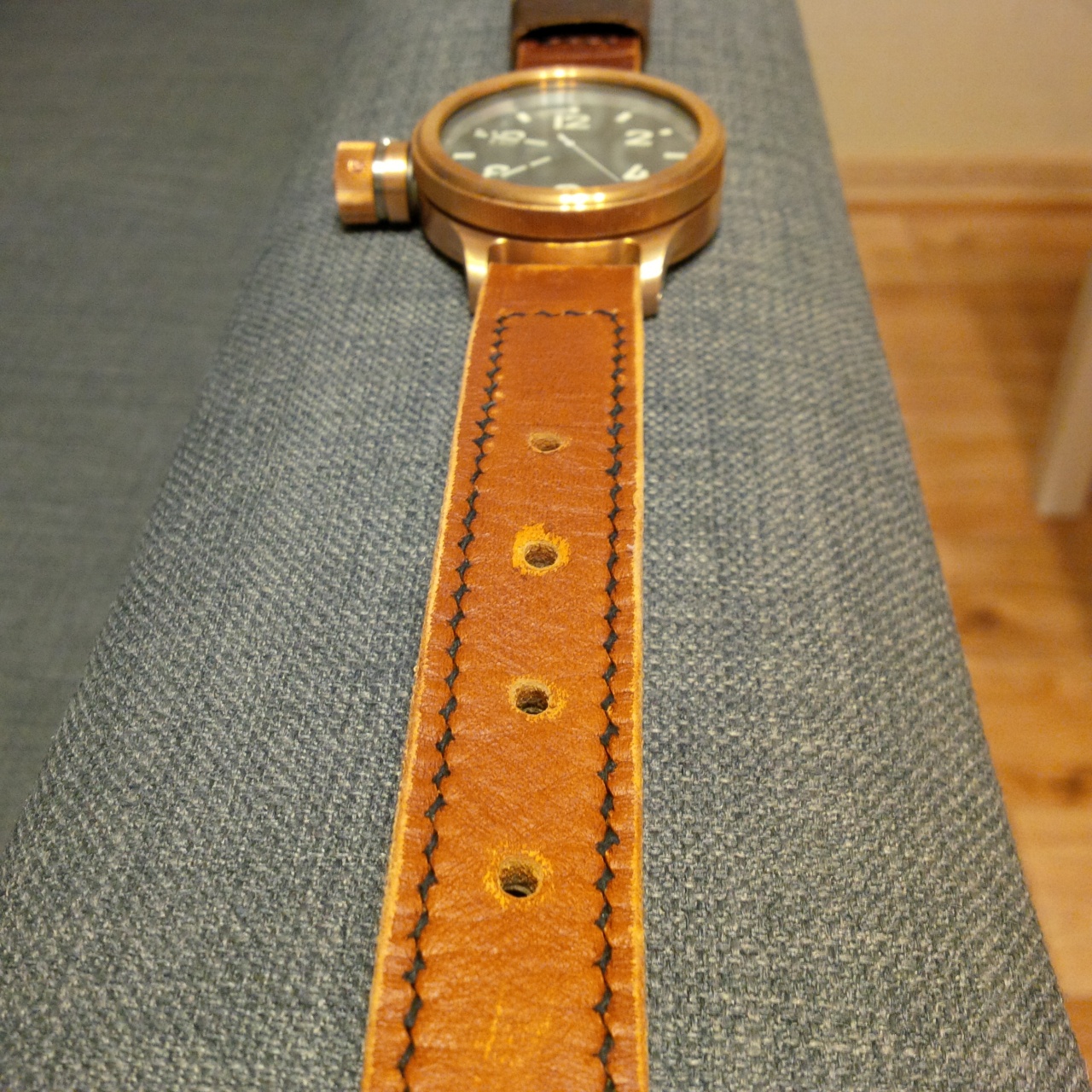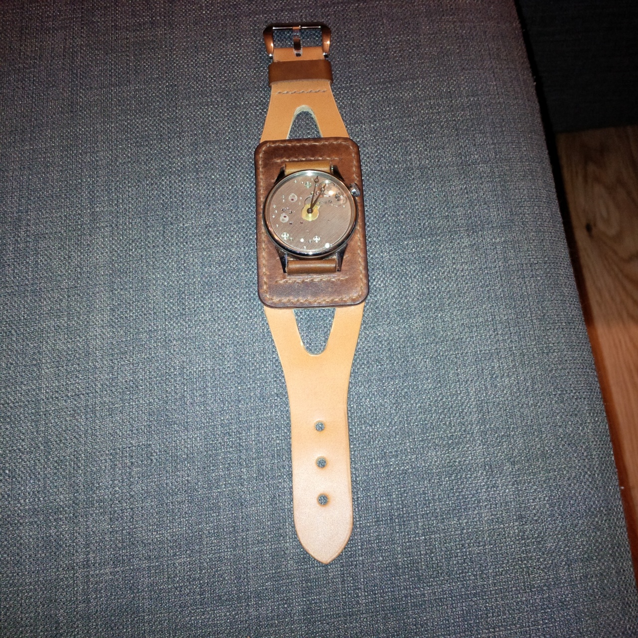 Немного повторюсь. Самое интересное, что кожа (зеленовато-серого оттенка) очень отлично ведет себя в воде, тестил ее при купаниях в бассене, за 7 занятий не потеряла форму, высыхает, становится такой же. Когда покупал, прод сказал, что химка, скорее всего хромового дубления. все остальное как обычно резаки: ножницы, косяк, нить лен-0,63, пробойник косой 3,85мм, перед пробивкой пробоник втыкал в воск, торцы решил ничем не обрабатывать. Крепление часов по системе ремней нато, т.е. одна большая петля.