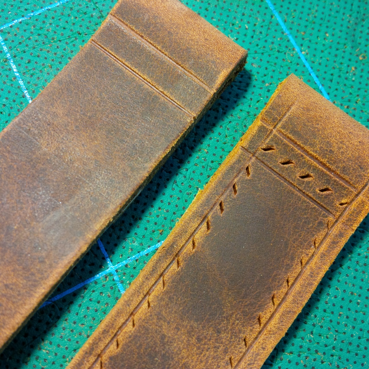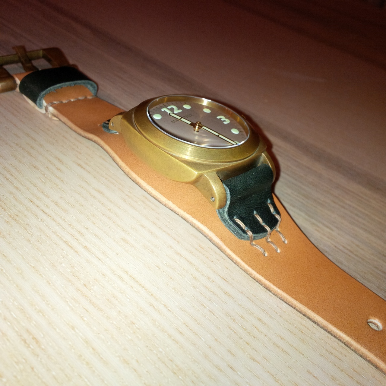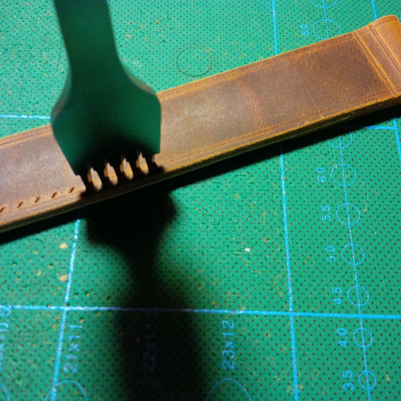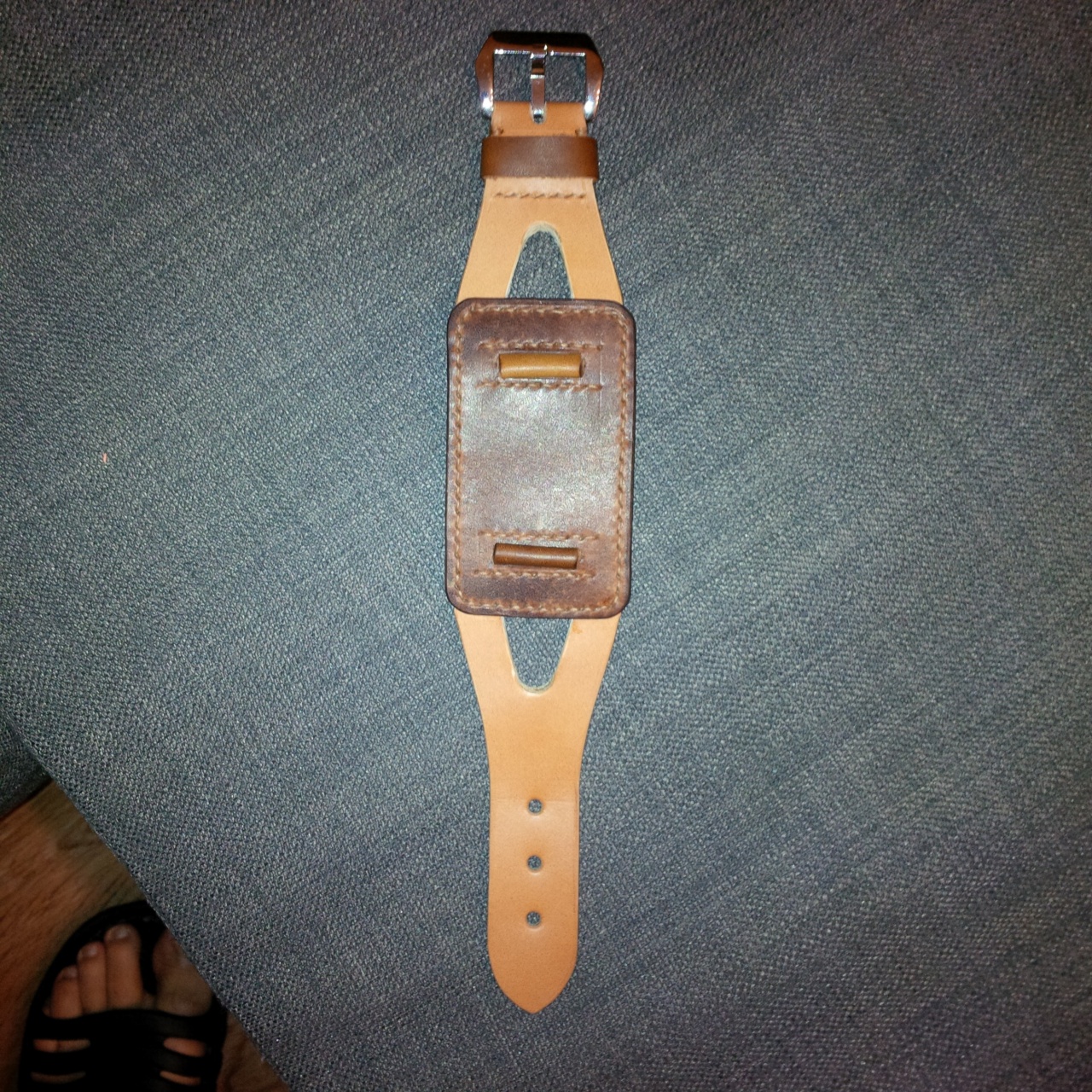 Немного повторюсь. Самое интересное, что кожа (зеленовато-серого оттенка) очень отлично ведет себя в воде, тестил ее при купаниях в бассене, за 7 занятий не потеряла форму, высыхает, становится такой же. Когда покупал, прод сказал, что химка, скорее всего хромового дубления. все остальное как обычно резаки: ножницы, косяк, нить лен-0,63, пробойник косой 3,85мм, перед пробивкой пробоник втыкал в воск, торцы решил ничем не обрабатывать. Крепление часов по системе ремней нато, т.е. одна большая петля.