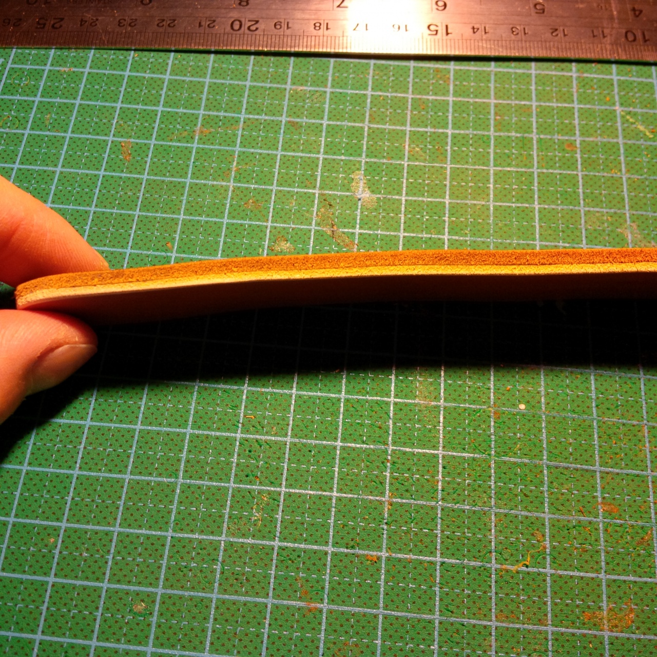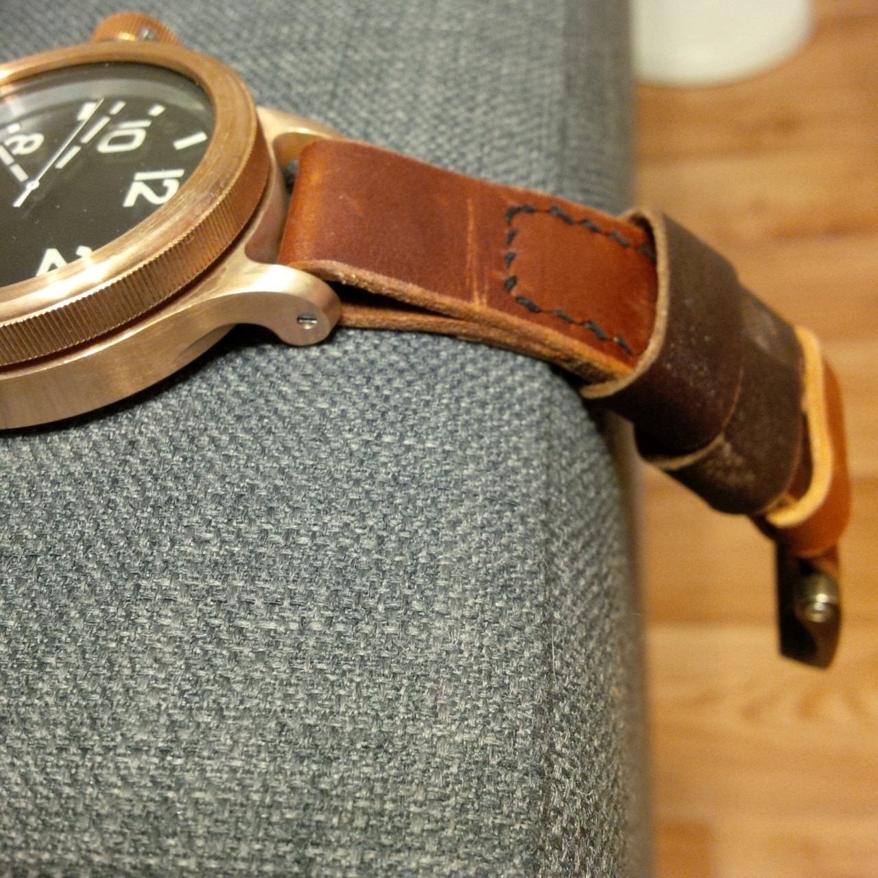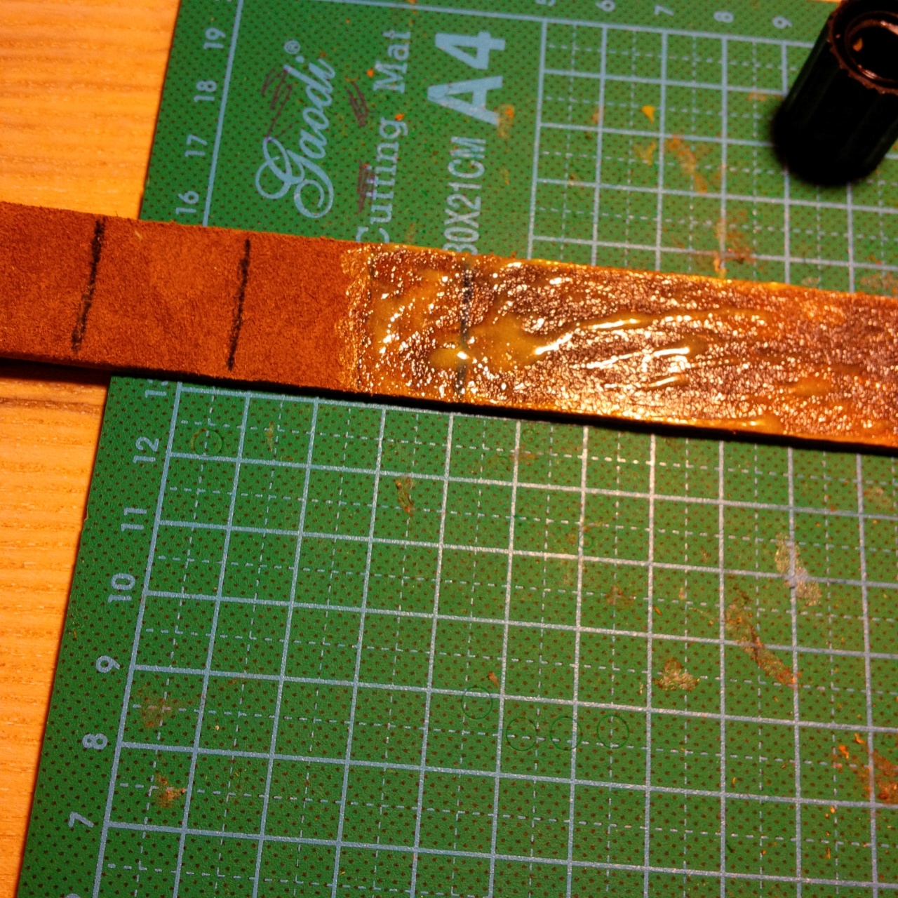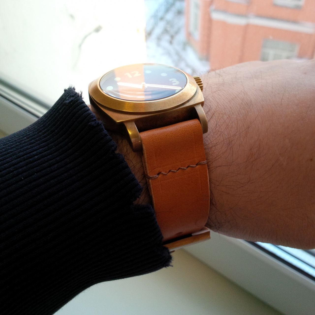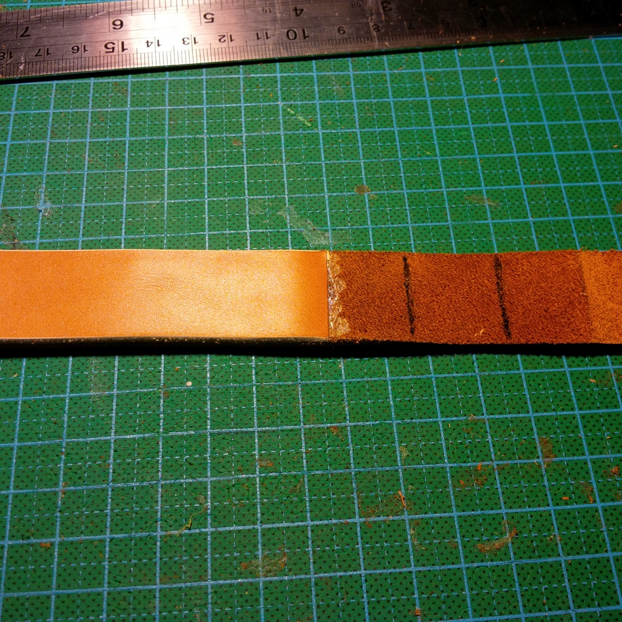 Немного повторюсь. Самое интересное, что кожа (зеленовато-серого оттенка) очень отлично ведет себя в воде, тестил ее при купаниях в бассене, за 7 занятий не потеряла форму, высыхает, становится такой же. Когда покупал, прод сказал, что химка, скорее всего хромового дубления. все остальное как обычно резаки: ножницы, косяк, нить лен-0,63, пробойник косой 3,85мм, перед пробивкой пробоник втыкал в воск, торцы решил ничем не обрабатывать. Крепление часов по системе ремней нато, т.е. одна большая петля.