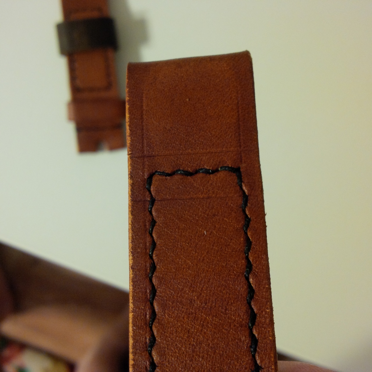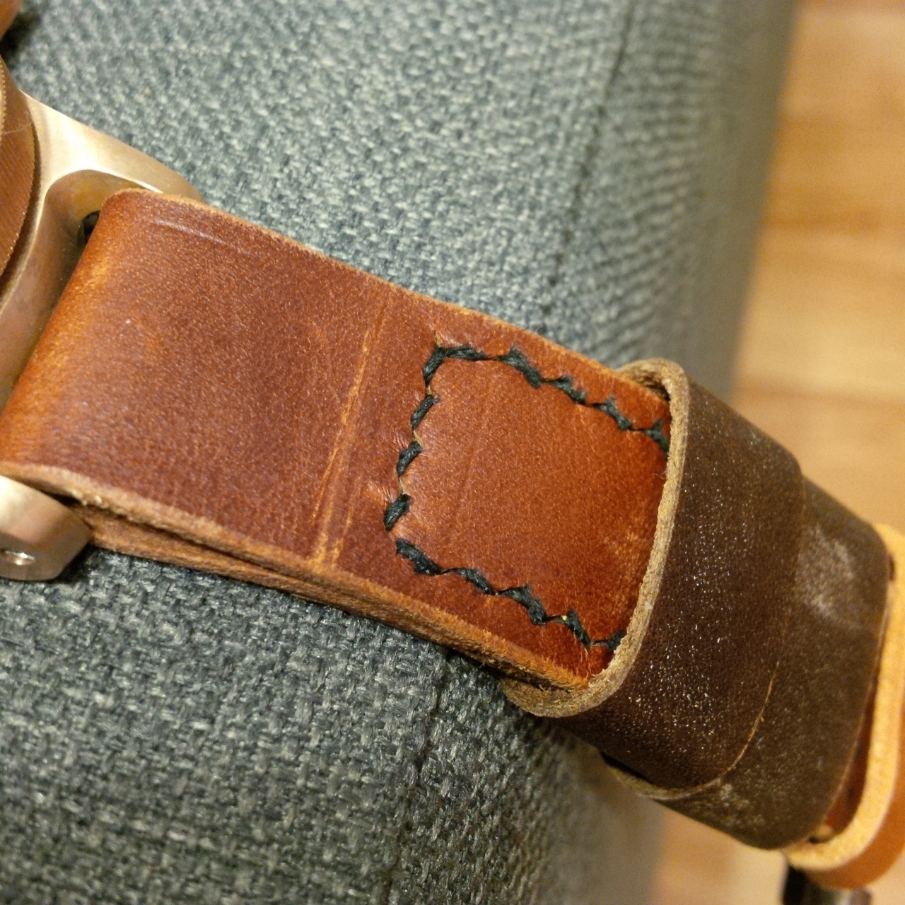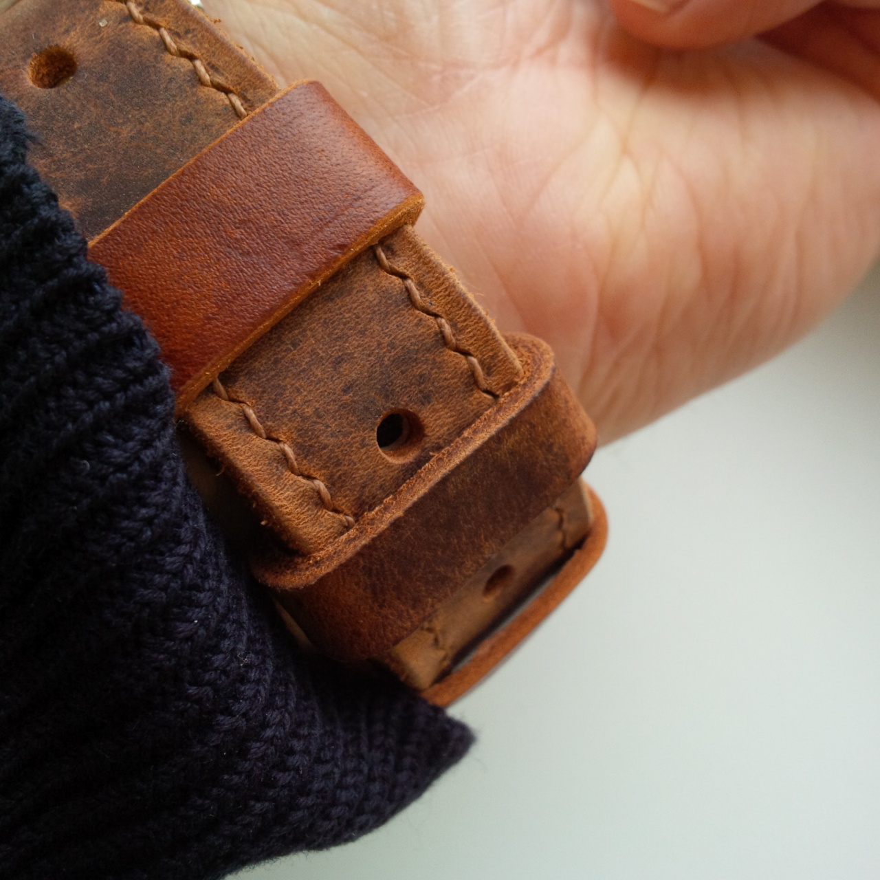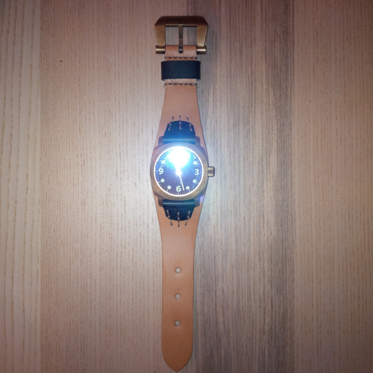 Немного повторюсь. Самое интересное, что кожа (зеленовато-серого оттенка) очень отлично ведет себя в воде, тестил ее при купаниях в бассене, за 7 занятий не потеряла форму, высыхает, становится такой же. Когда покупал, прод сказал, что химка, скорее всего хромового дубления. все остальное как обычно резаки: ножницы, косяк, нить лен-0,63, пробойник косой 3,85мм, перед пробивкой пробоник втыкал в воск, торцы решил ничем не обрабатывать. Крепление часов по системе ремней нато, т.е. одна большая петля.