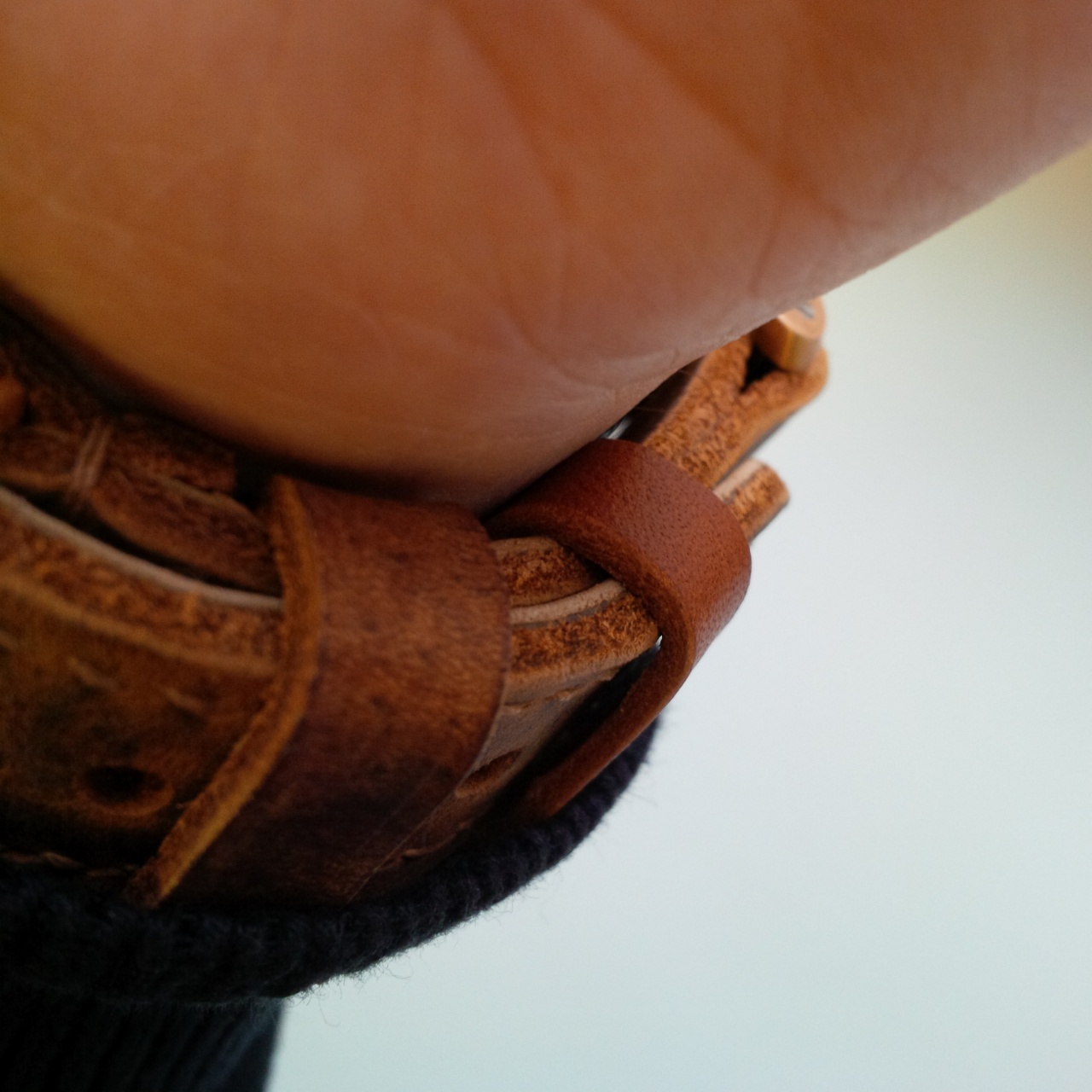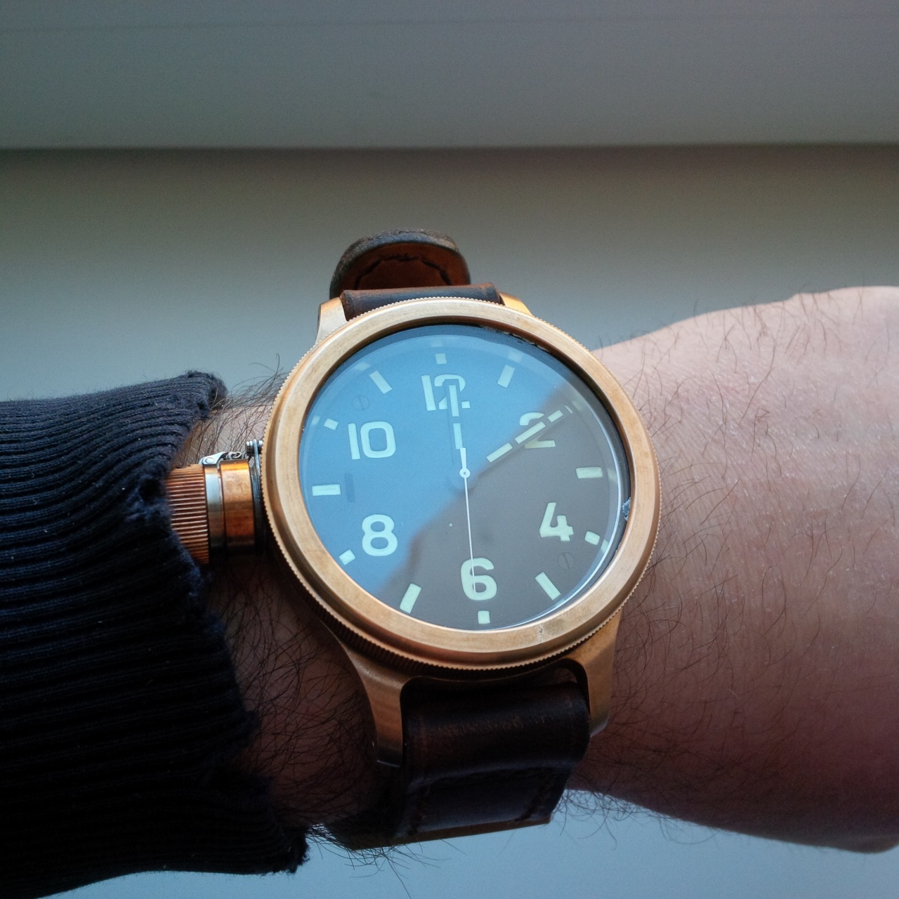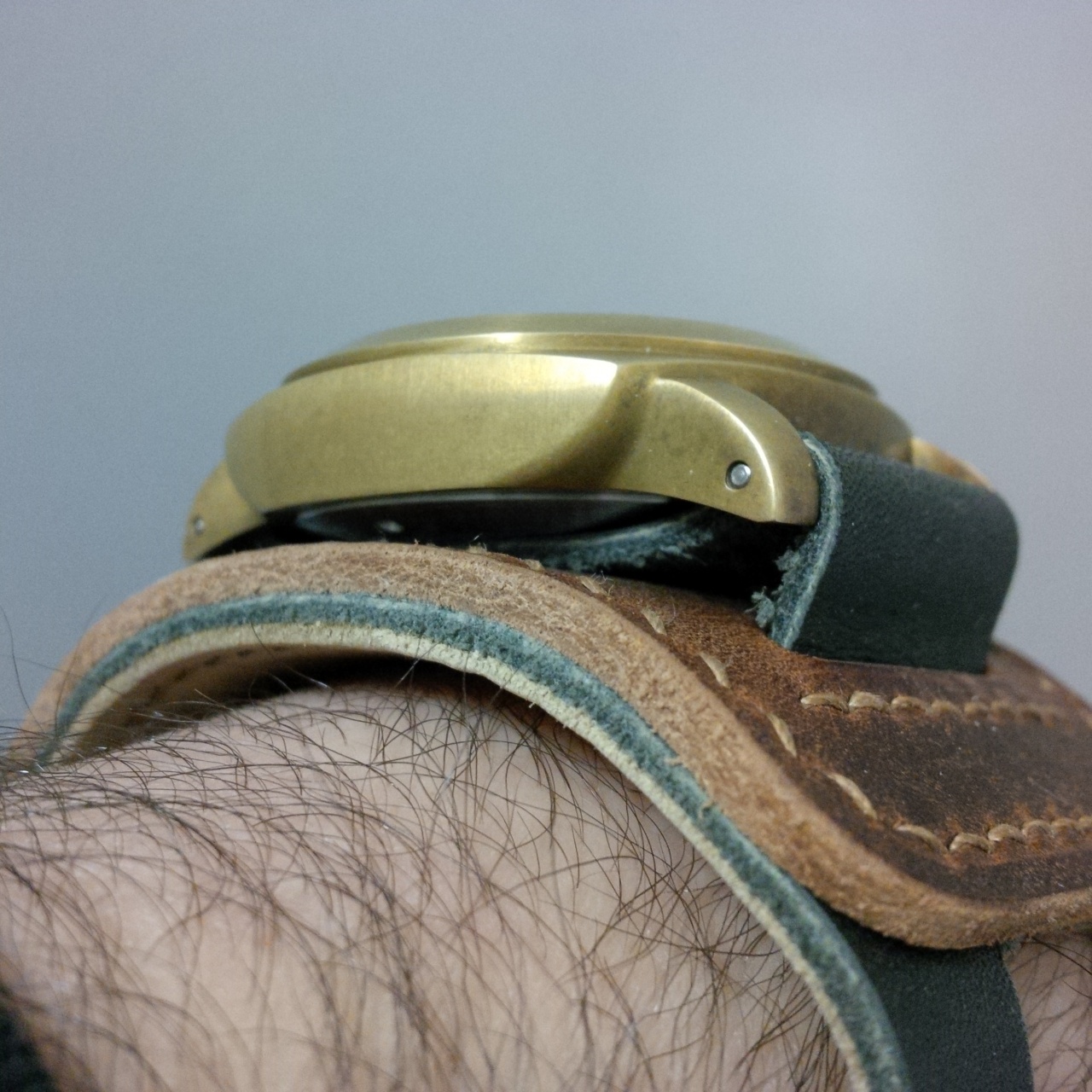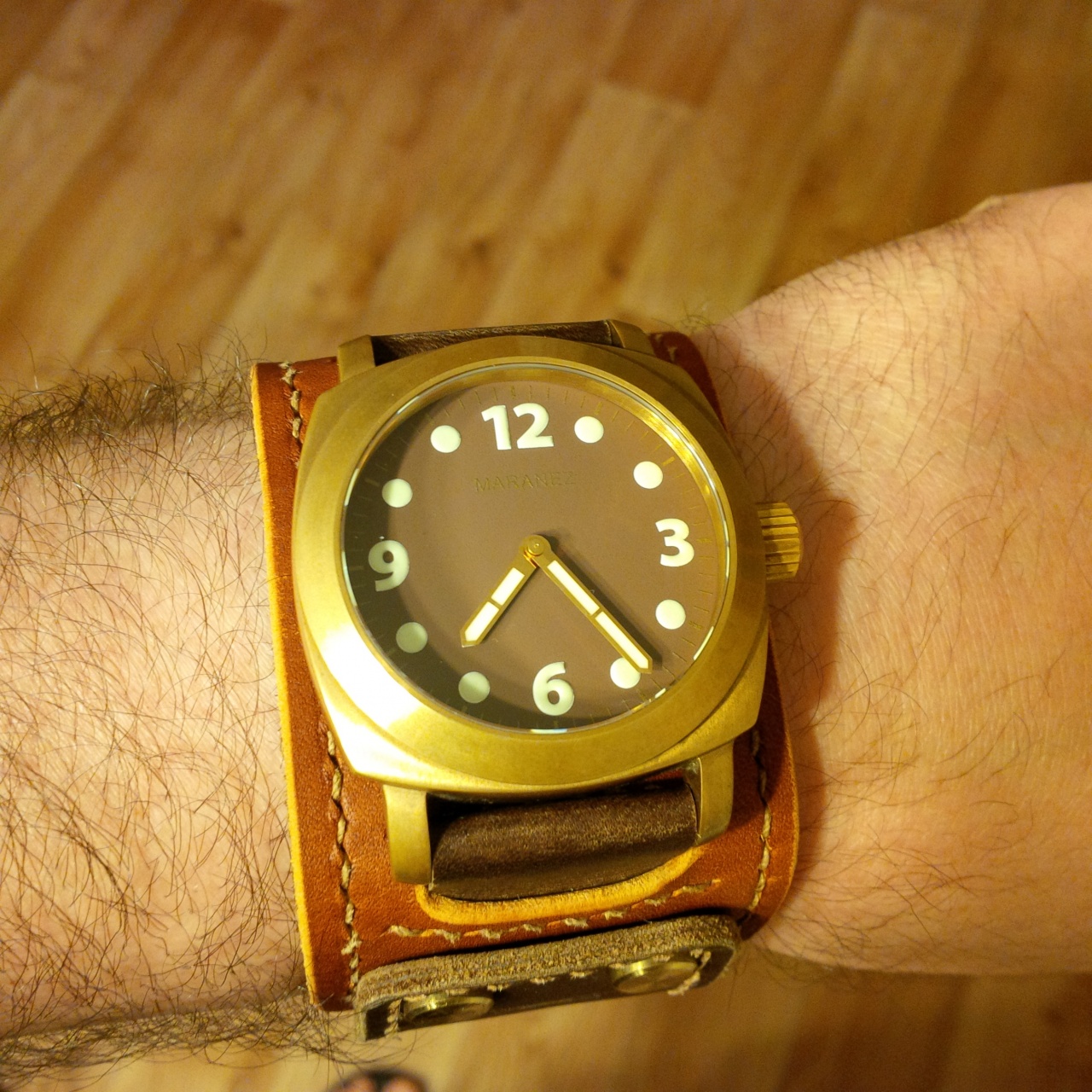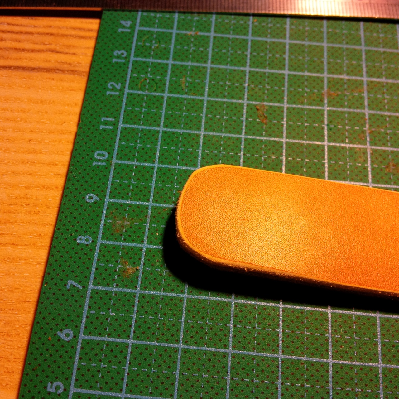 Немного повторюсь. Самое интересное, что кожа (зеленовато-серого оттенка) очень отлично ведет себя в воде, тестил ее при купаниях в бассене, за 7 занятий не потеряла форму, высыхает, становится такой же. Когда покупал, прод сказал, что химка, скорее всего хромового дубления. все остальное как обычно резаки: ножницы, косяк, нить лен-0,63, пробойник косой 3,85мм, перед пробивкой пробоник втыкал в воск, торцы решил ничем не обрабатывать. Крепление часов по системе ремней нато, т.е. одна большая петля.