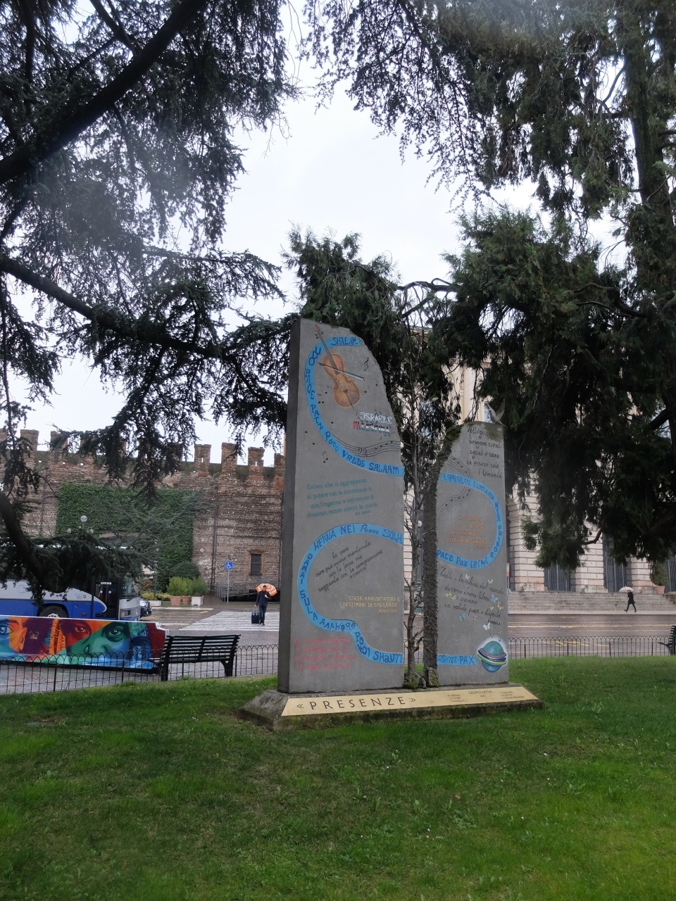 Если бы не было Шекспира и Ромео& Юлии, то в городке и смотреть было бы нечего. Пара-тройка соборов, римский цирк, римский же театр, мост и две площади. Ну, разве что всякие невидные тонкости - например, тротуар из ракушечника со следами ископаемых организмов. Однако в силу литературного гения появились еще дома обоих персонажей (Джульетты - музей, Ромео - жилой), могила Джульетты, несколько памятников разного вида, размера и стиля. Разных - это если где чего по двое (людей, столбов, железобетонных плит) - то это обязательно памятник влюбленным героям Шекспира. Не уверен только в этом, увидемши пару разноцветных мужичков и пару же скворечников. Хотя... Кто его знает... Поскольку я люблю средневековые городки - то погулял с удовольствие. Но чего-то совсем великого не отметил. А, может, просто не знал, где смотреть.