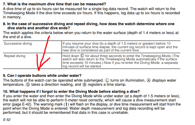 The buttons of the watch can be operated while submerged. L turns on illumination, A displays water