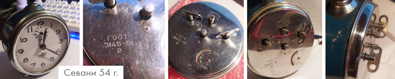 Прилагаю фото своего будильника - 54 года, более позднего - с центральной сигнальной стрелкой, и еще более позднего - в таком виде они выпускались, кажется, до 80-х годов. Фото не мои, взяты с Авито