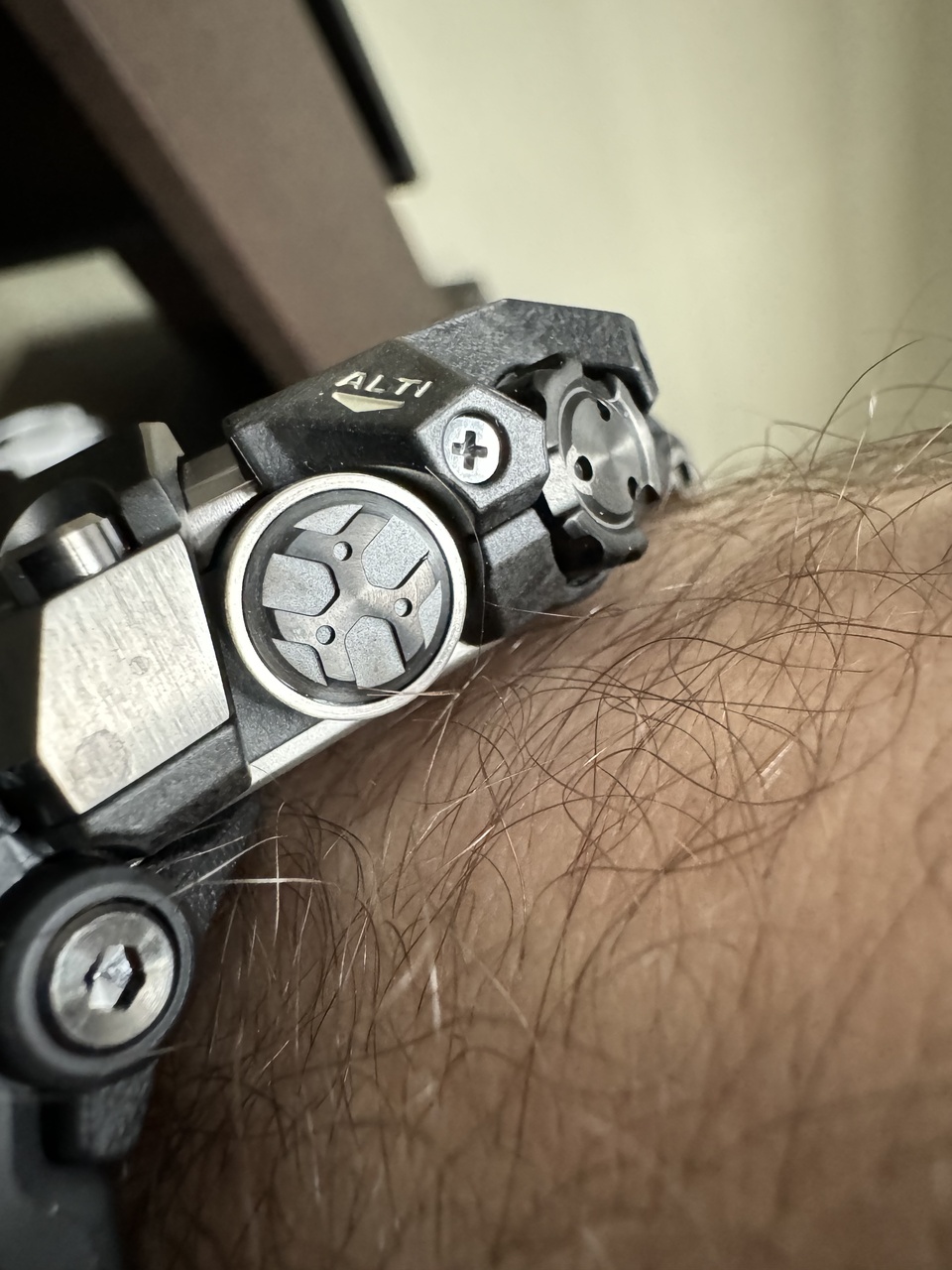 Про стрелки часов отмечу, что секундная здесь очень изящно выполнена буквально ниточкой с резной петелькой на конце, это контрастирует лопатообразными минутной и часовой стрелками и делает их общий вид более воздушным. Также очень понравилась треугольная стрелка целеуказателя (которая справа в кружке). В отличии от дерганно-порывистой секундной эта имеет максимально плавный ход, её движение по оси завораживает. Пару слов про дисплей. Он хоть и инверсионный и не MIP, но за счет крупного размера его показания легко читаемы при любом освещении. Кнопки имеют приятную фактуру с рисунком, глубокий пружинистый ход и полностью беззвучны. Прям шикарные кнопки. Завинчивающаяся головка на любителя, хоть и стандартна уже для кучи G-Shock. Мне с моими пальцами, рассчитанными больше на турник, тяжело понять, когда надо остановиться в завинчивании на исходное положение- страшно сломать, но и боязно не докрутить, оставив часы без герметичности.