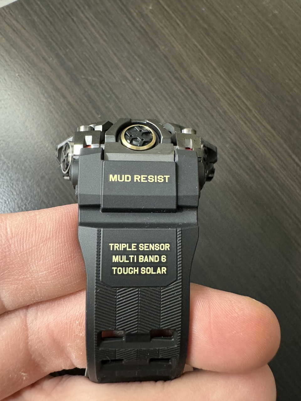 Теперь про браслет. Он оставил противоречивое впечатления. С одной стороны очень радует независимая подвижная накладка между браслетом и часами, это всегда улучшаяет посадку на руке, нивелируя пустое пространство. Также традиционные массивные металлические застежка и тренчик придают часам солидности. Правда, почему-то они разного оттенка и фактуры, но это заметно только при тщательном близком осмотре. А вот что сразу ощущается, так это жесткий наощупь и плохо гнущийся материал браслета. Он не облегает руку и нет в нем шелковистости как у GW-5000U. Напротив, он либо мертвой хваткой впивается в запястье при узкой регулировке, либо болтается негнущимся кольцом, если ослабить. Надеюсь, что со временем это. Материал всё же примет более близкую к моему запястью форму. При этом внешняя поверхность здесь рифленая, что потенциально будет постоянным грязе- пылесборником. Может, придираюсь, но после идеального гладкого и мягкого браслета GW-A1000 этот мне не особо нравится, приятные эмоции не вызывает, хоть на вид и очень крепкий. Но носить можно и менять его я вряд ли соберусь.