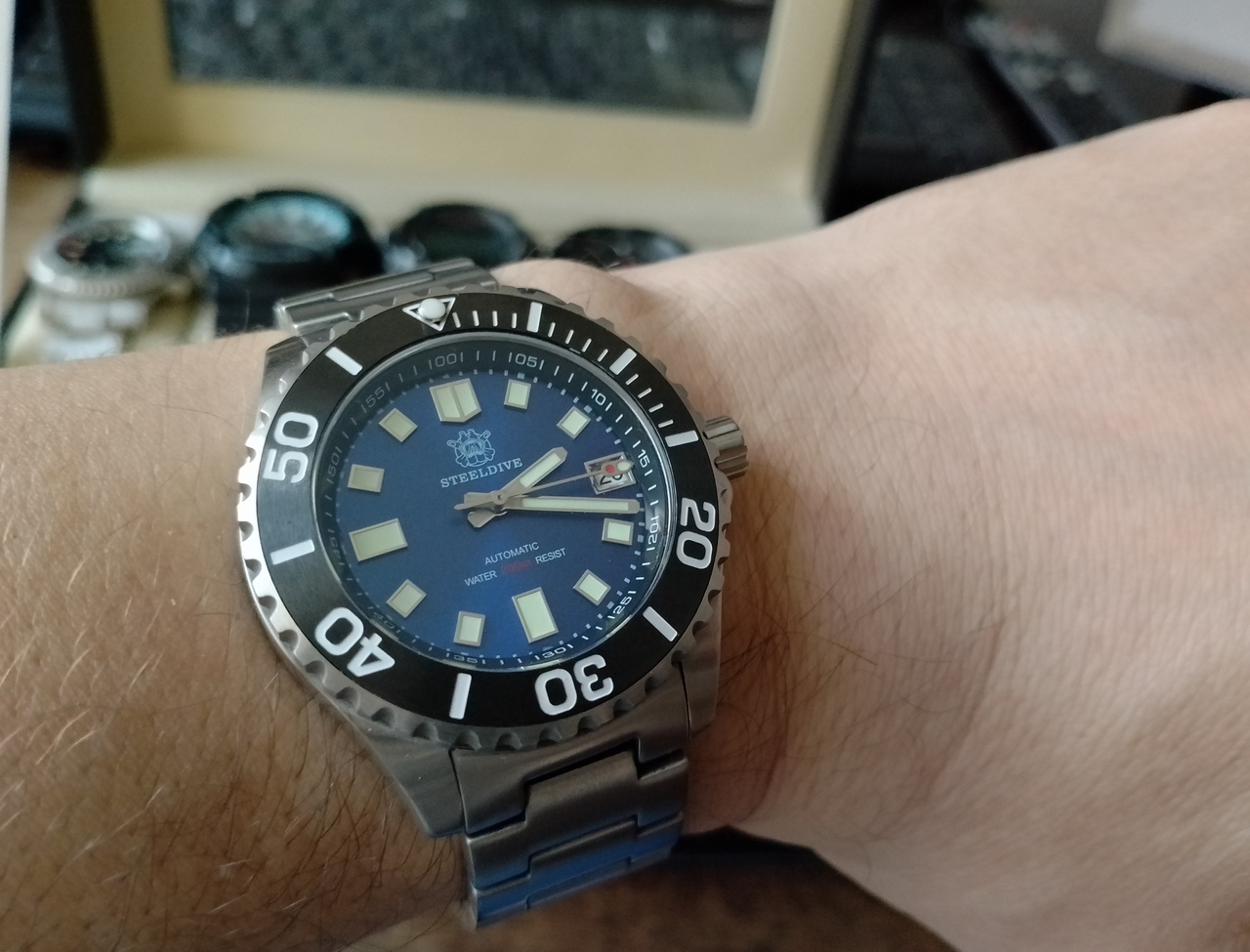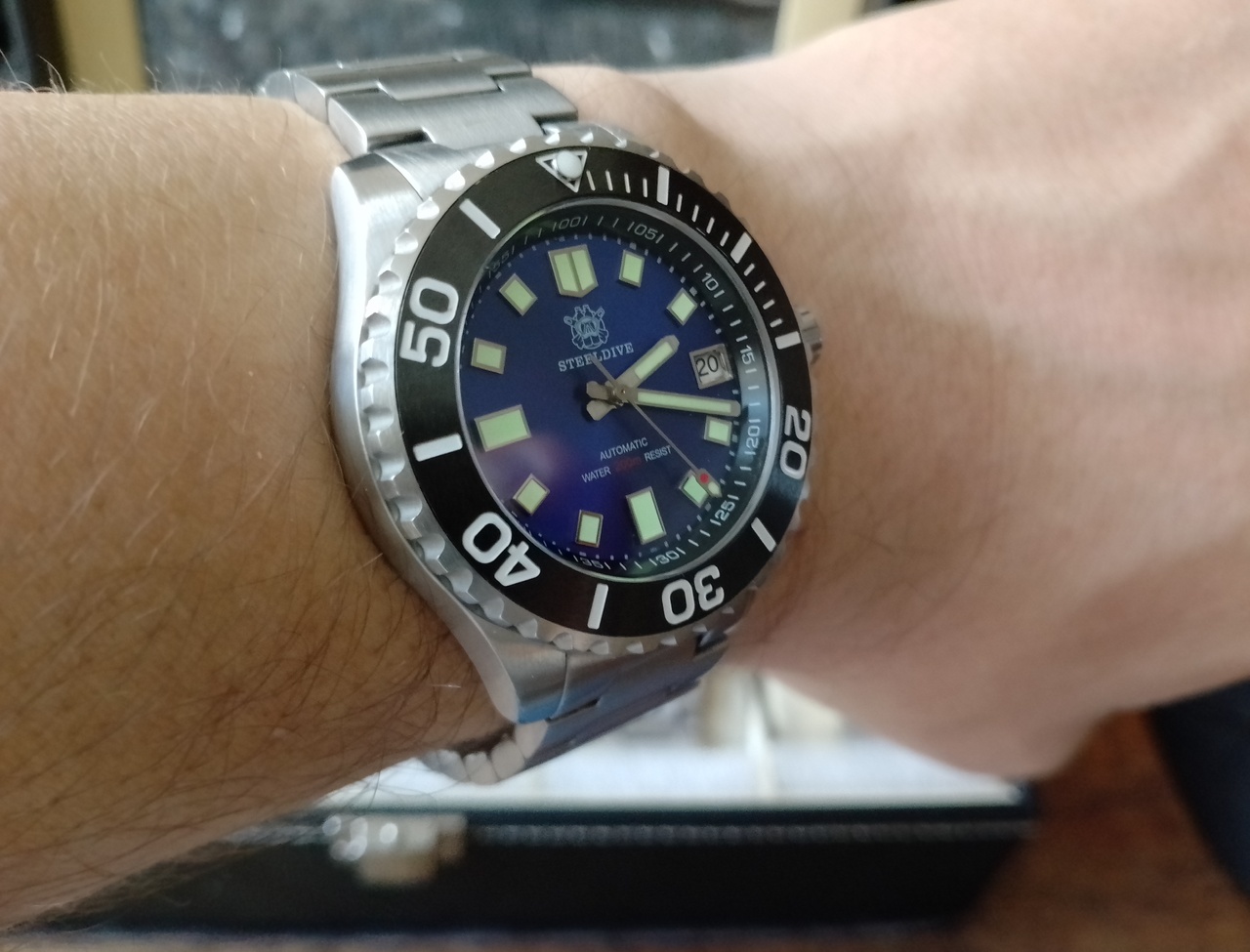 http://forum.watch.ru/attachment.php...1&d=1744631747 ), другие SteelDive (хомаж на Seiko 6105 Капитан Виллард), у первых сломался механизм, у вторых на футоре заводной коронки сточилась резьба и накрылась трещётка на безеле, так или иначе, получилось, что двое часов валяются без дела (одни с хорошим корпусом и браслетом, другие с хорошим циферблатом и механизмом), решил из двух сломанных собрать одни рабочие и получилось, причём, на тот момент у меня не было толкового инструмента даже, а был простой мини-наборчик с а...пресса. Стрелки часовую и минутную насаживал стержнем от шариковой авторучки, а секундную стрелку - затупленной деревянной зубочисткой (спасибо за совет товарищу
