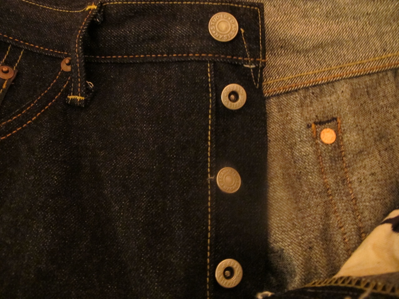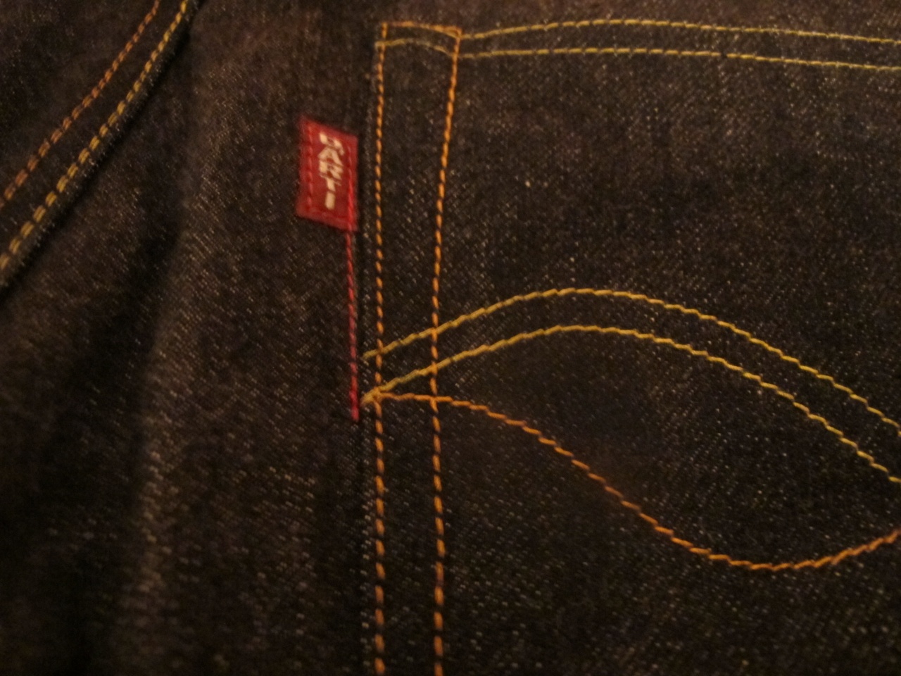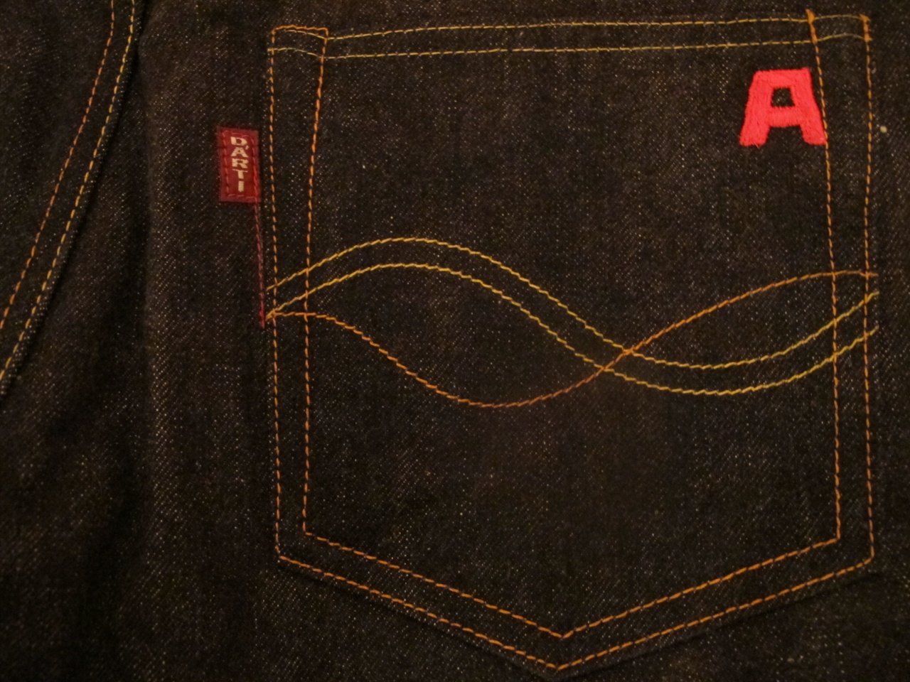 К созданию джинсов приложили руку 4 мастера. Юй Куниоши – шитье (мастерская Double Violante), Иско Цуйкобашигава – вышивка, Сиронин Зенрю – мастер-каллиграф, вручную расписал мешковину карманов, Цуйоши Охама – производитель индиго (окрасил монетный карман). Деним джинсов – стандартный 15 oz SDA, вроде бы на сайте Double Violante утверждается, что какая-то специальная окраска на нем, но возможно, что как раз весь стандартный деним SDA и имеется в виду. Кромка красного цвета. Строчки прошиты нитями 5-ти разных оттенков, нити имеют разную толщину – 3 вида. Болты - их 4, 2 от SDA, 2 от Double Violante. Расположены через один. Монетный карман из свиной кожи, окрашен индиго вручную. Заклепки на передних карманах составные – медно-стальные. Шлевки прошиты 2-мя строчками разного цвета. На патче (он из козьей кожи) изображена иммиграционная печать (дань годам управления администрацией США), такая же печать на мешковине правого переднего кармана. На мешковине левого кармана - трогательная каллиграфическая роспись и серийный номер изделия. На патче еще изображена красная буква «A», такая же вышита на правом кармане. Фактически это – «Approved», т.е. «Разрешено армией США», означало разрешение посещений определенных баров и ресторанов Окинавы военнослужащими военных американских баз. Прежде всего, это относилось к стандартам безопасности, принятыми в Штатах, но также местные владельцы заведений, на дверях которых не было этого знака, могли таким образом говорить, что их посещение подвыпившими молодчиками в форме нежелательно. В 1972 году знак был отменен. Арки на задних карманах знаменуют собой голубя, знак мира, рядом с правым карманом пришит «ред таб» в виде флага, символа мира на Окинаве, который «голубь» как бы несет в клюве. «Ред таб» не вшит в карман, а прошит отдельно от него.